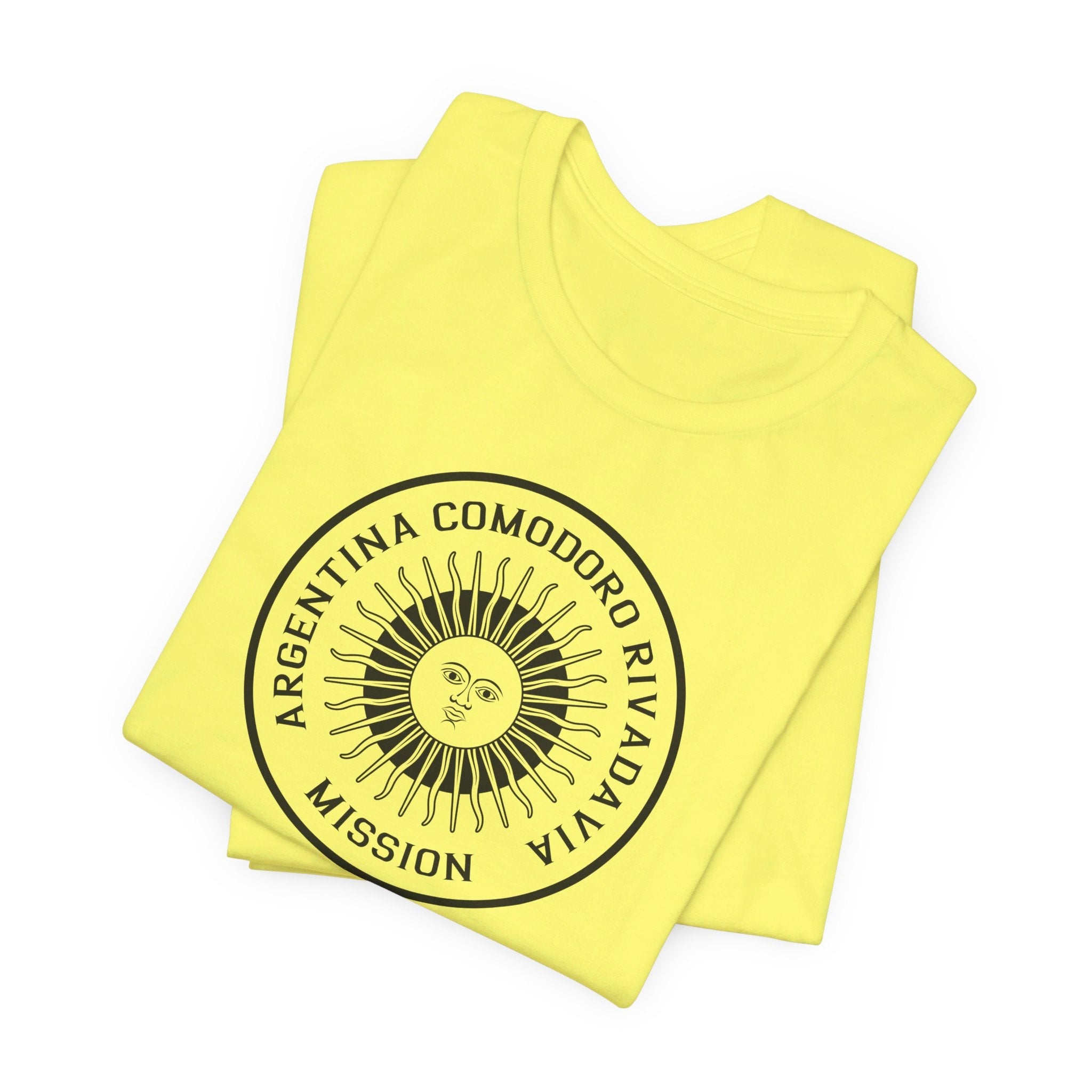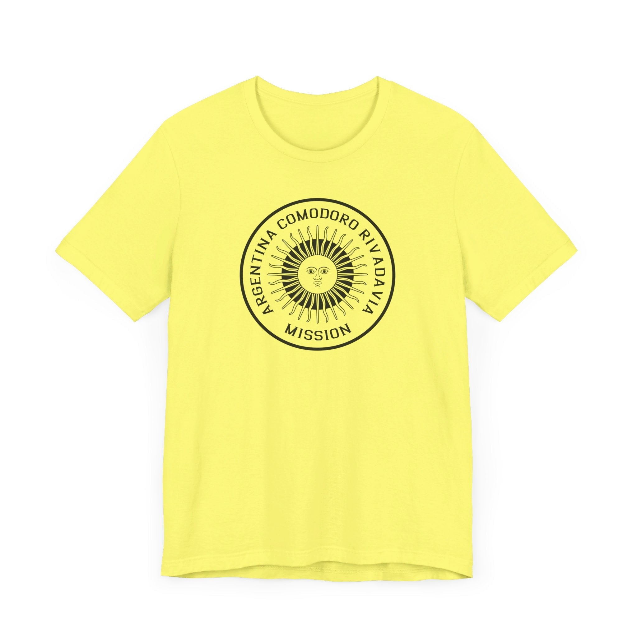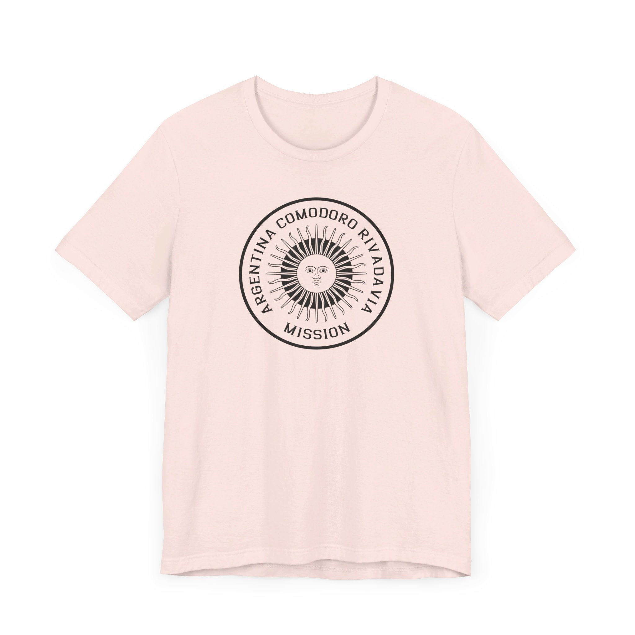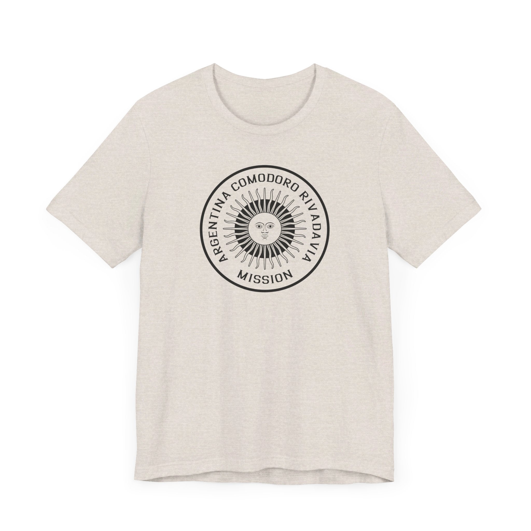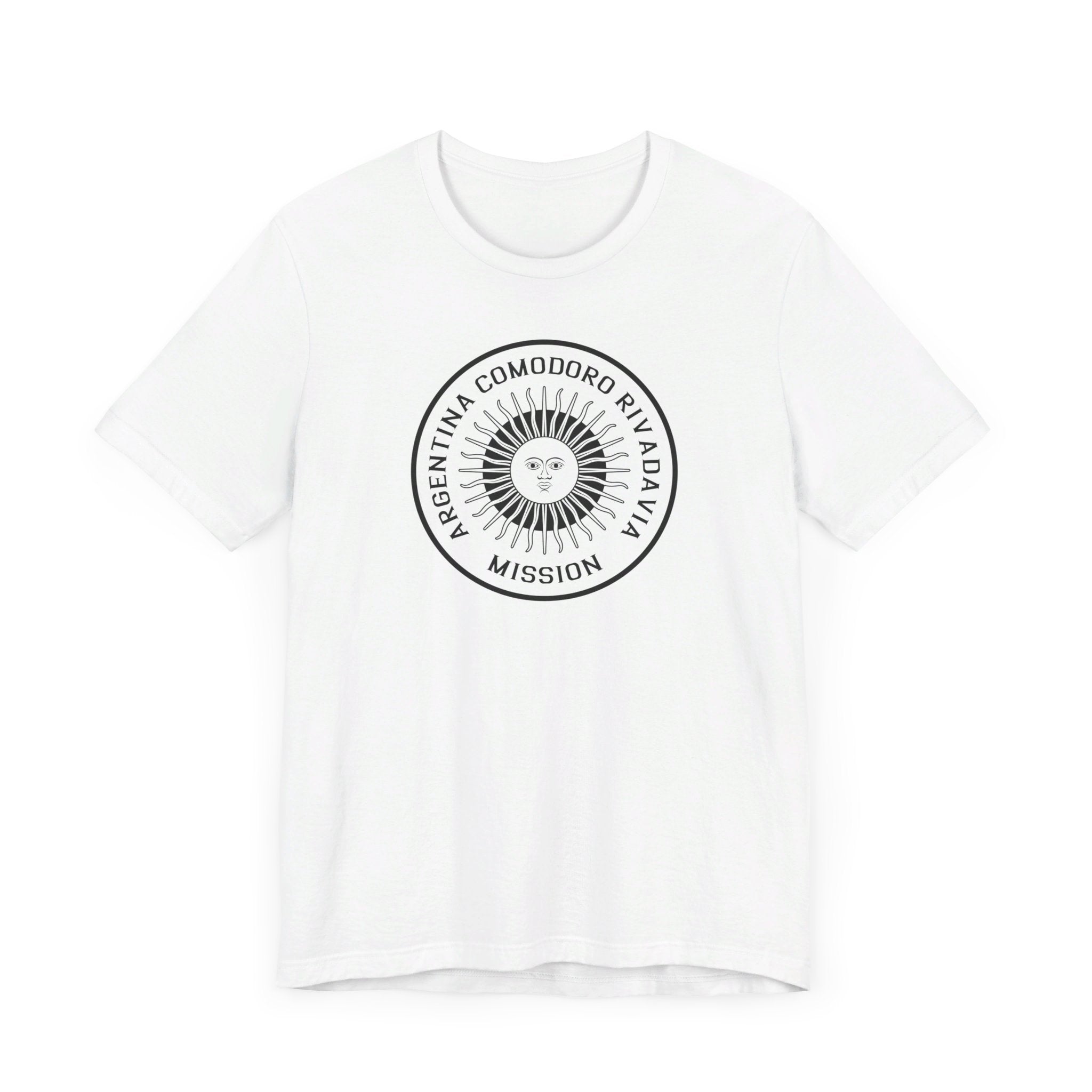 - Bold Monochrome Logo: The centerpiece of this T-shirt is an original logo crafted by our team for the Argentina Comodoro Rivadavia Mission, that considers emblems and symbology of the regions served in the mission.