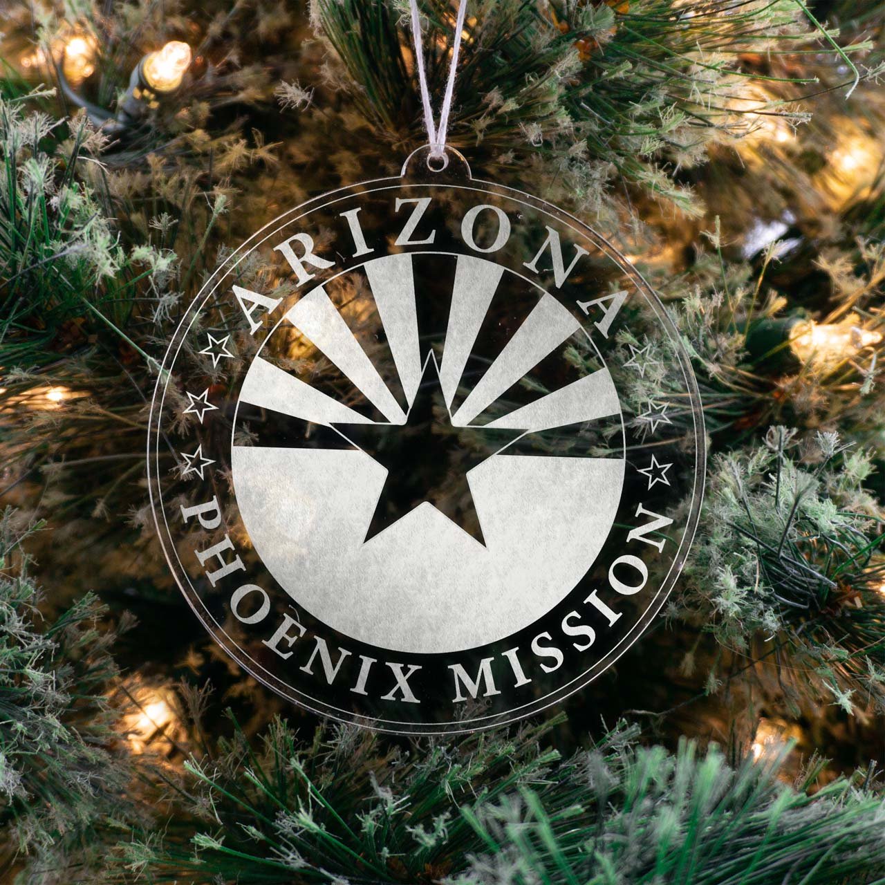 Made out of a lightweight and very durable transparent acrylic, these ornaments will not weigh your tree down and can definitely withstand being dropped by the little ones should they get too curious around the tree. The acrylic is cut into a 4 inch circle and then laser etched with the name of the mission and graphics inspired by the region served.