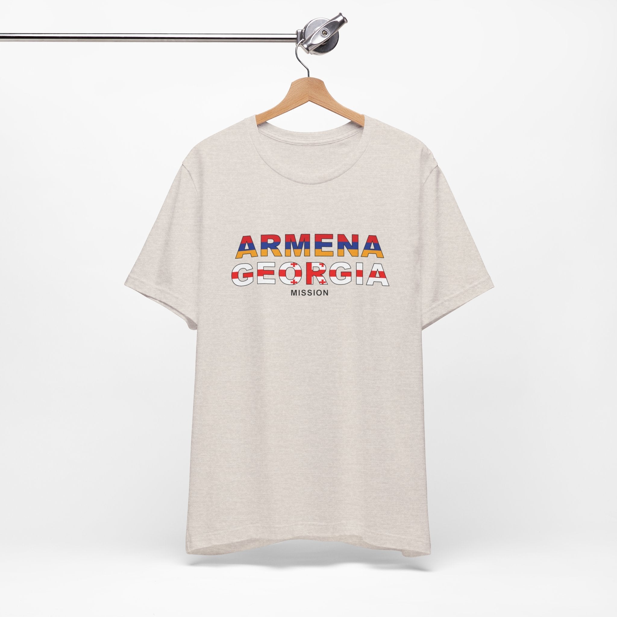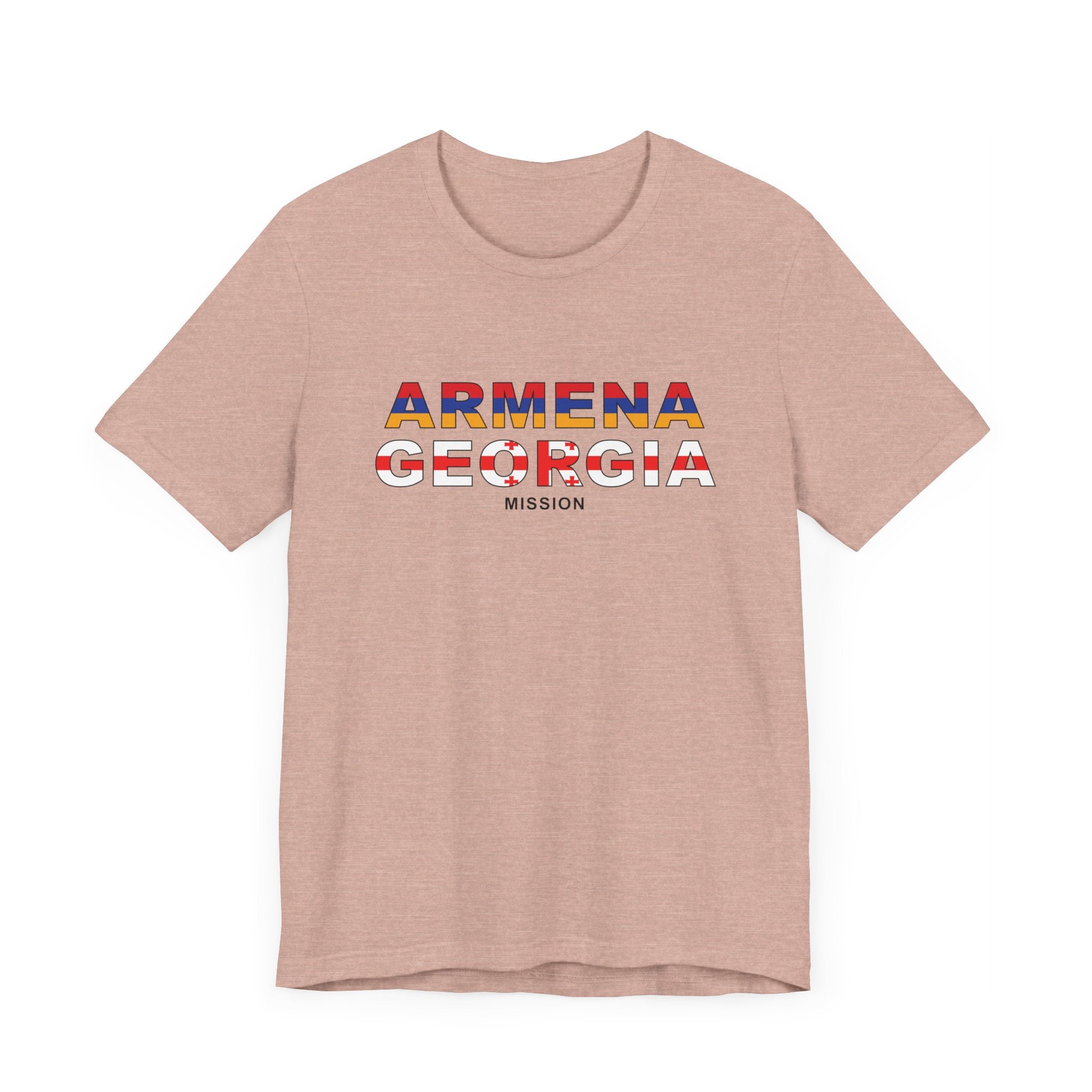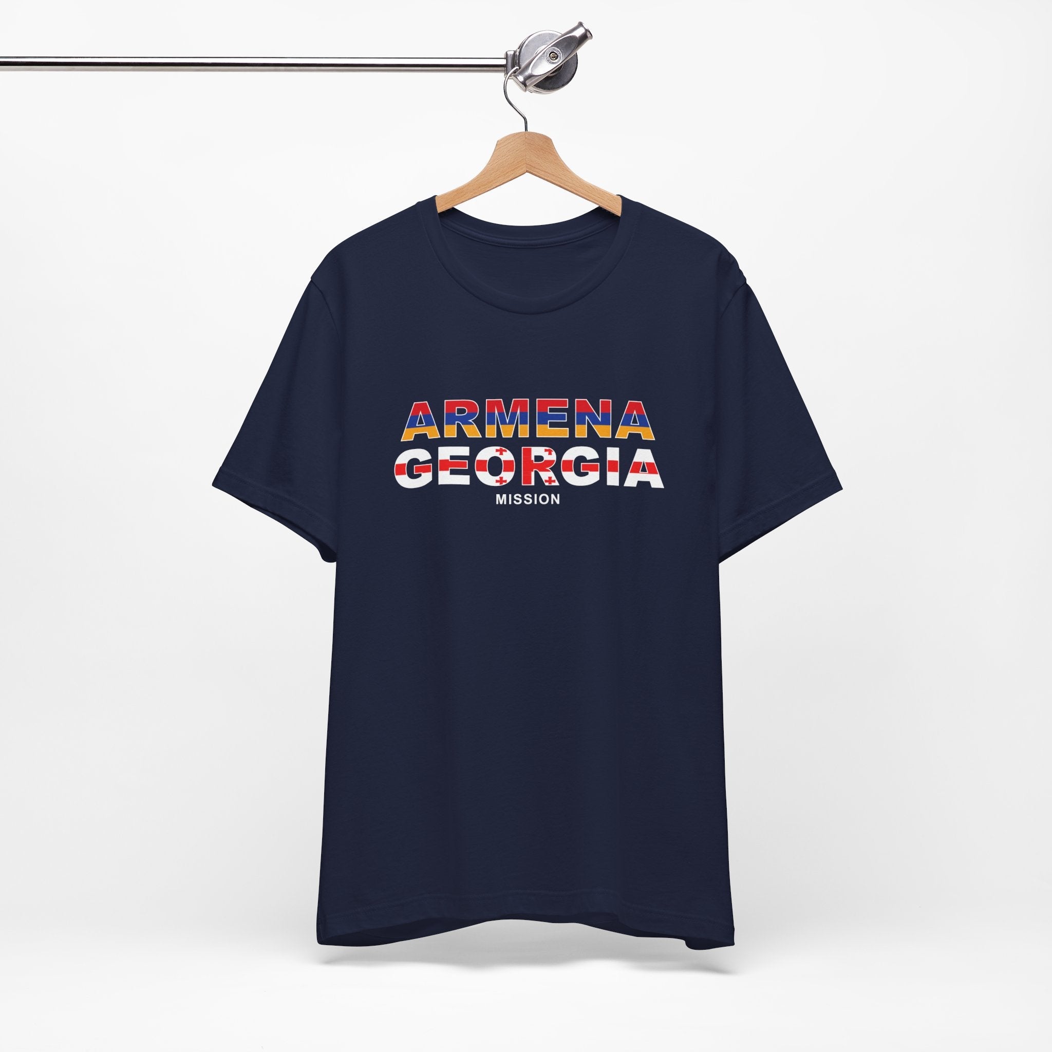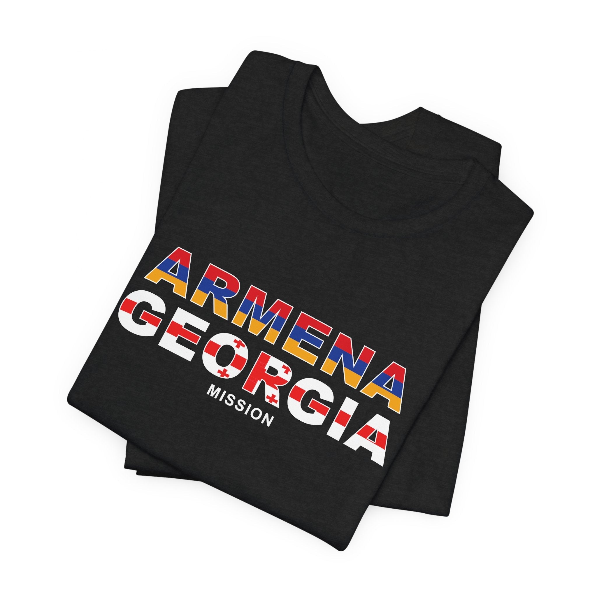 What sets this t-shirt apart is its unique design element: it features the flag of neatly superimposed over the Armenia - Georgia Mission's name. This striking visual not only adds a vibrant splash of color to the design but also symbolizes the missions unity and commitment to the regions community. The flag's intricate details are carefully rendered to ensure clarity and impact, making this t-shirt a standout piece in any wardrobe.