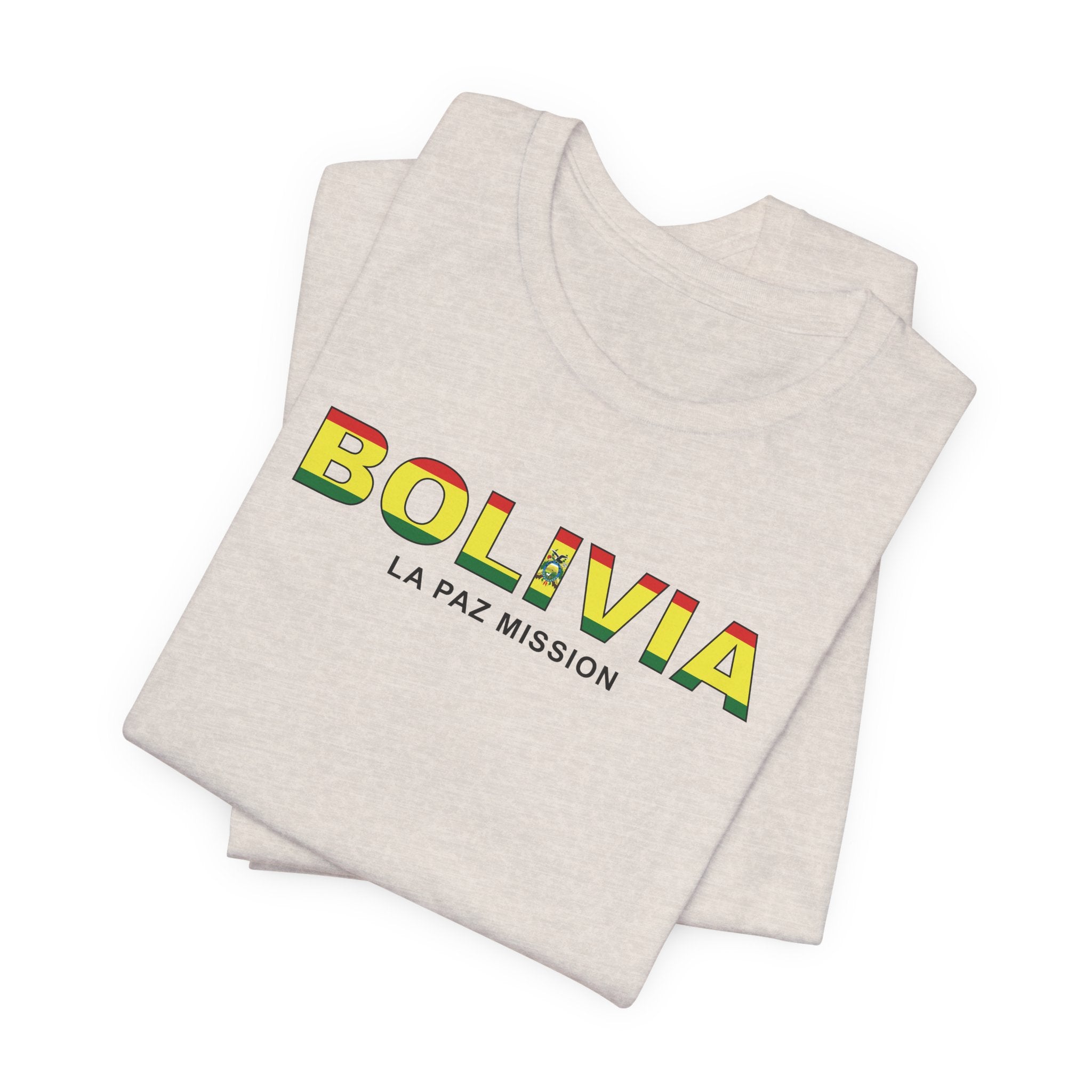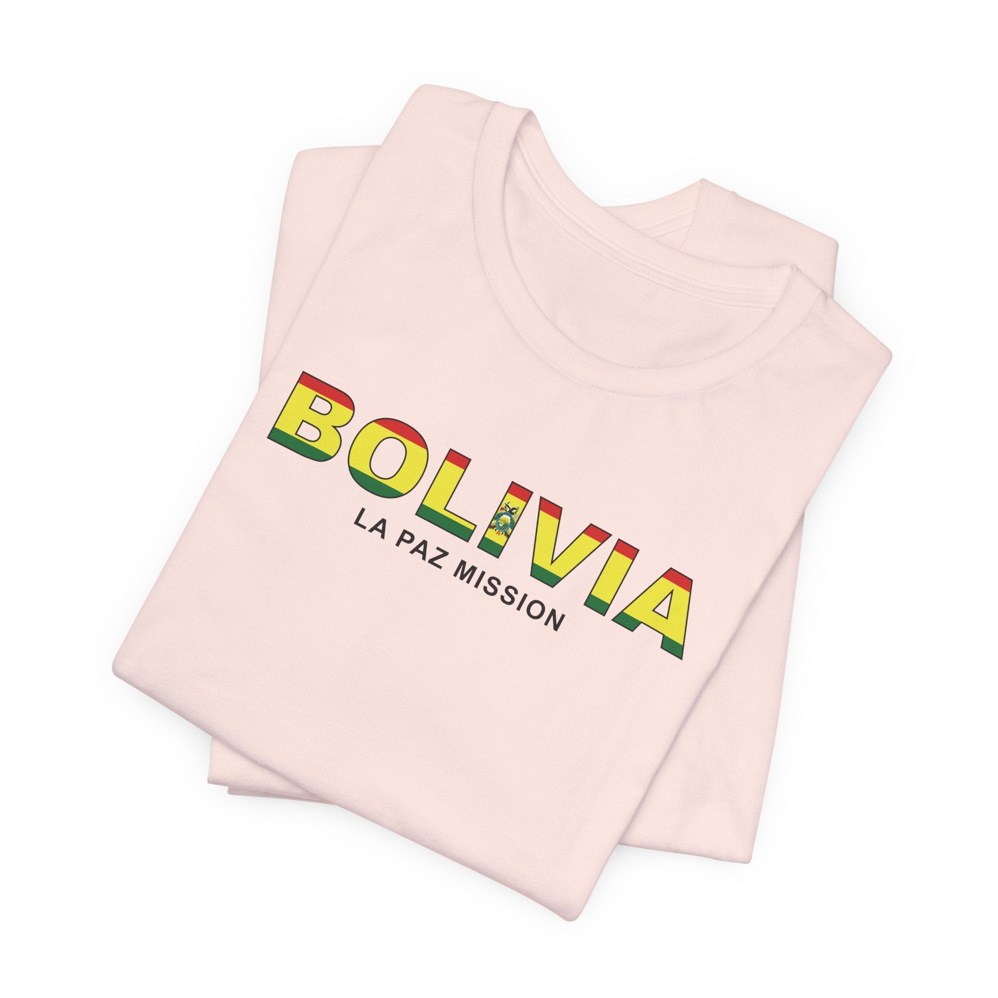 What sets this t-shirt apart is its unique design element: it features the flag of Bolivia neatly superimposed over the Bolivia La Paz Mission's name. This striking visual not only adds a vibrant splash of color to the design but also symbolizes the missions unity and commitment to the regions community. The flag's intricate details are carefully rendered to ensure clarity and impact, making this t-shirt a standout piece in any wardrobe.