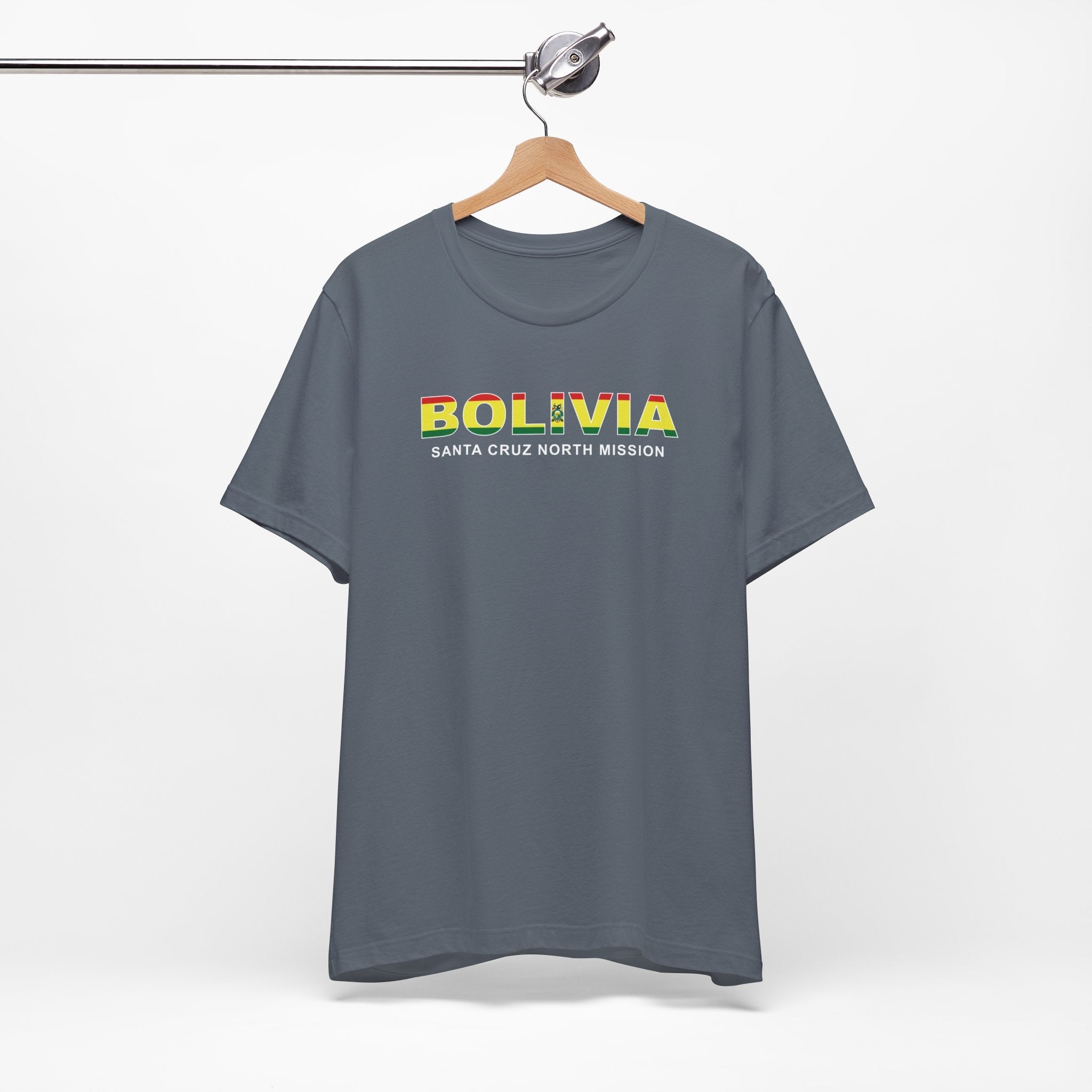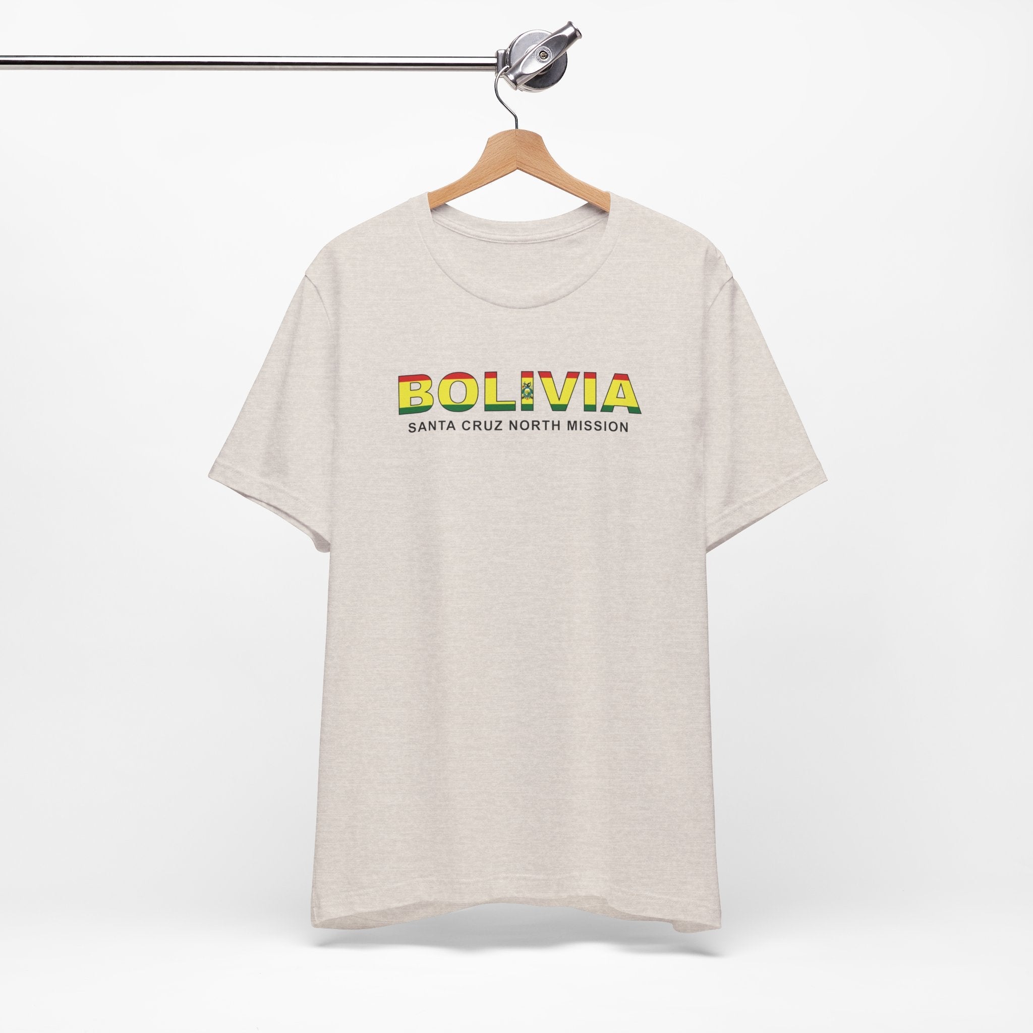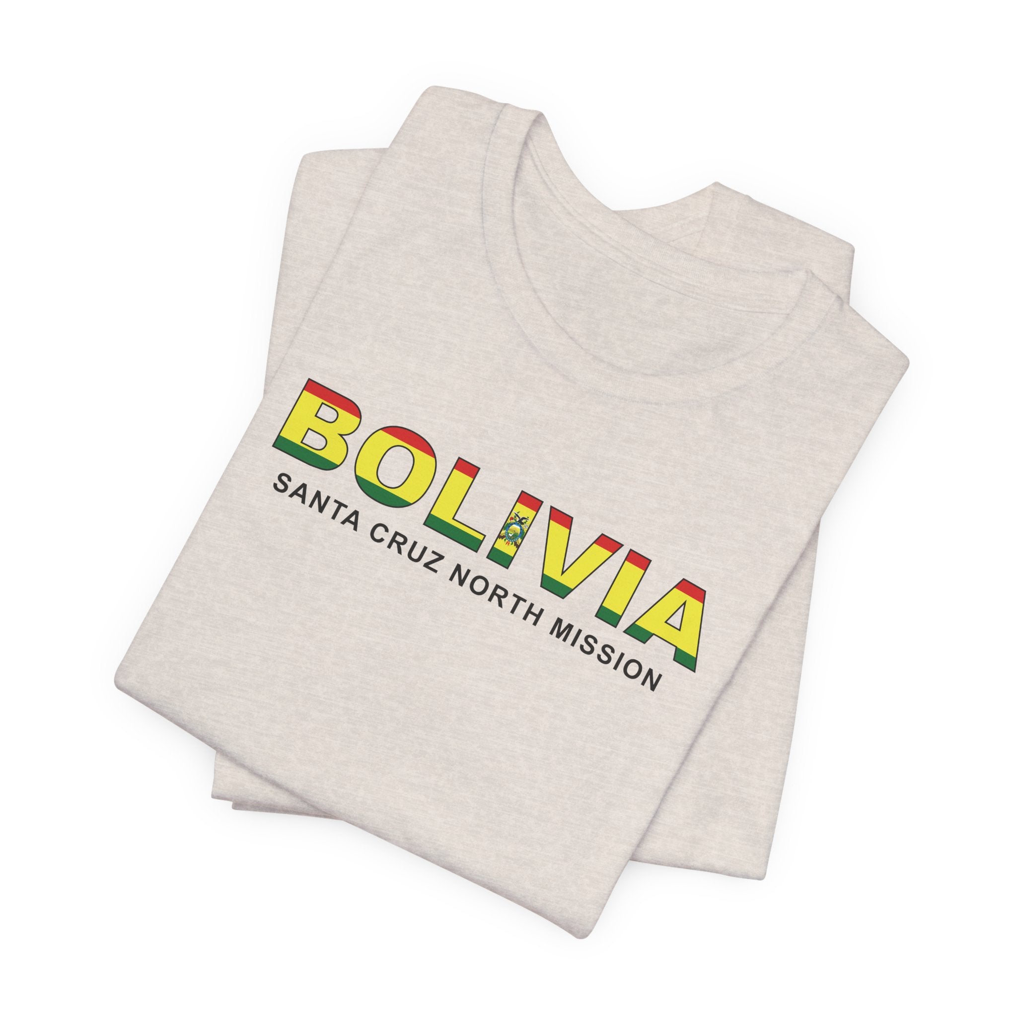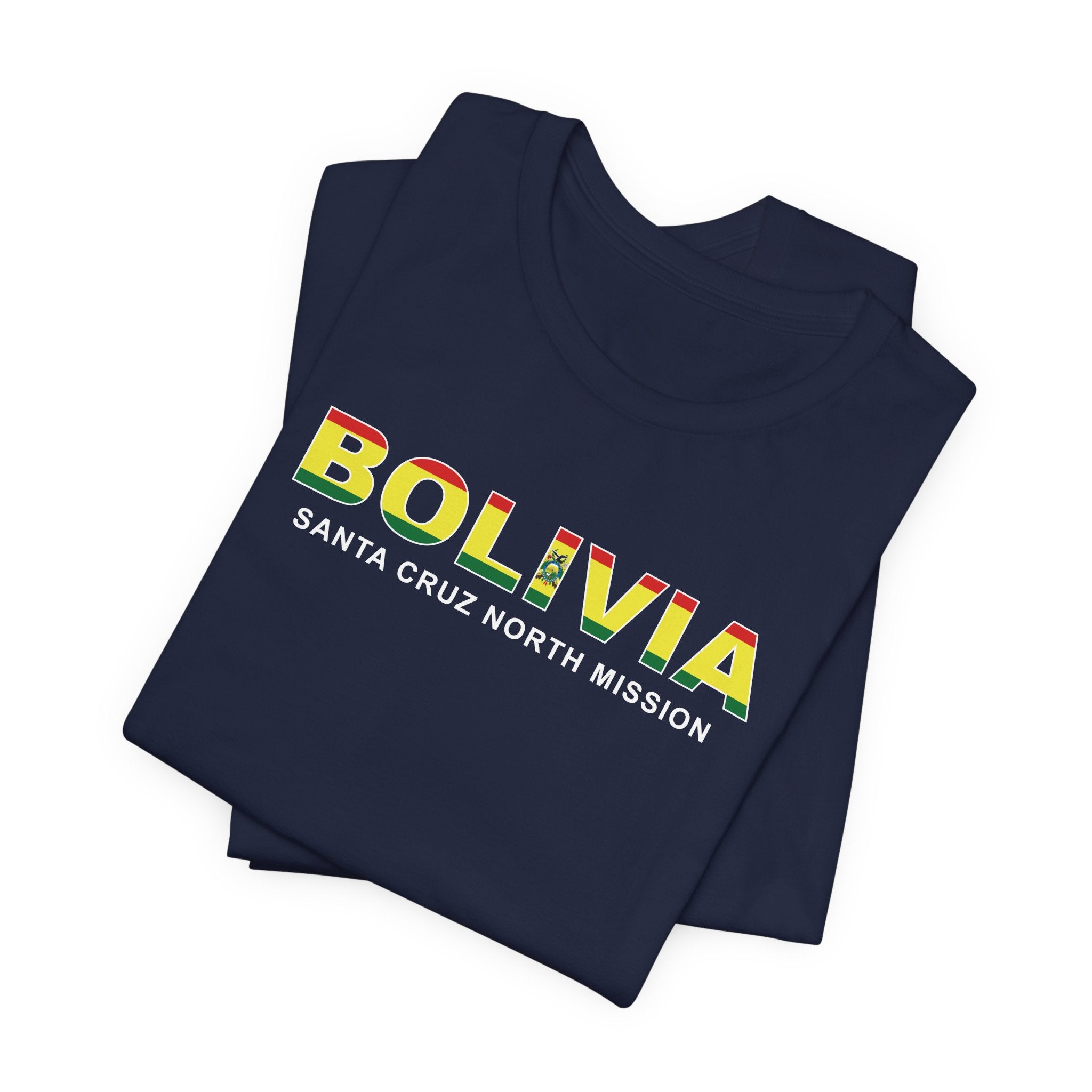 What sets this t-shirt apart is its unique design element: it features the flag of Bolivia neatly superimposed over the Bolivia Santa Cruz North Mission's name. This striking visual not only adds a vibrant splash of color to the design but also symbolizes the missions unity and commitment to the regions community. The flag's intricate details are carefully rendered to ensure clarity and impact, making this t-shirt a standout piece in any wardrobe.