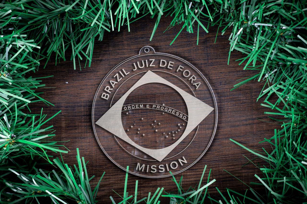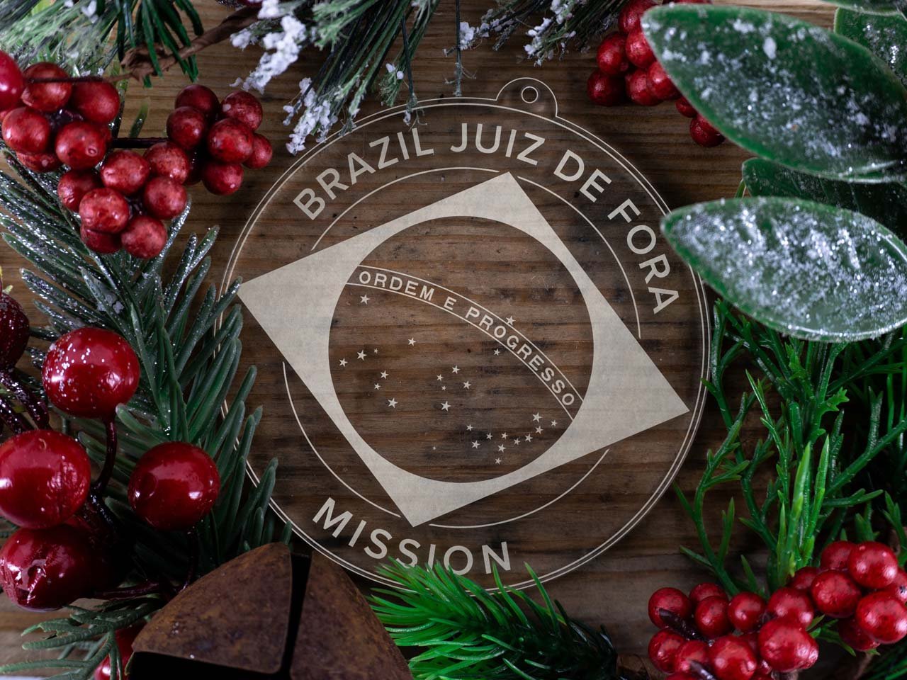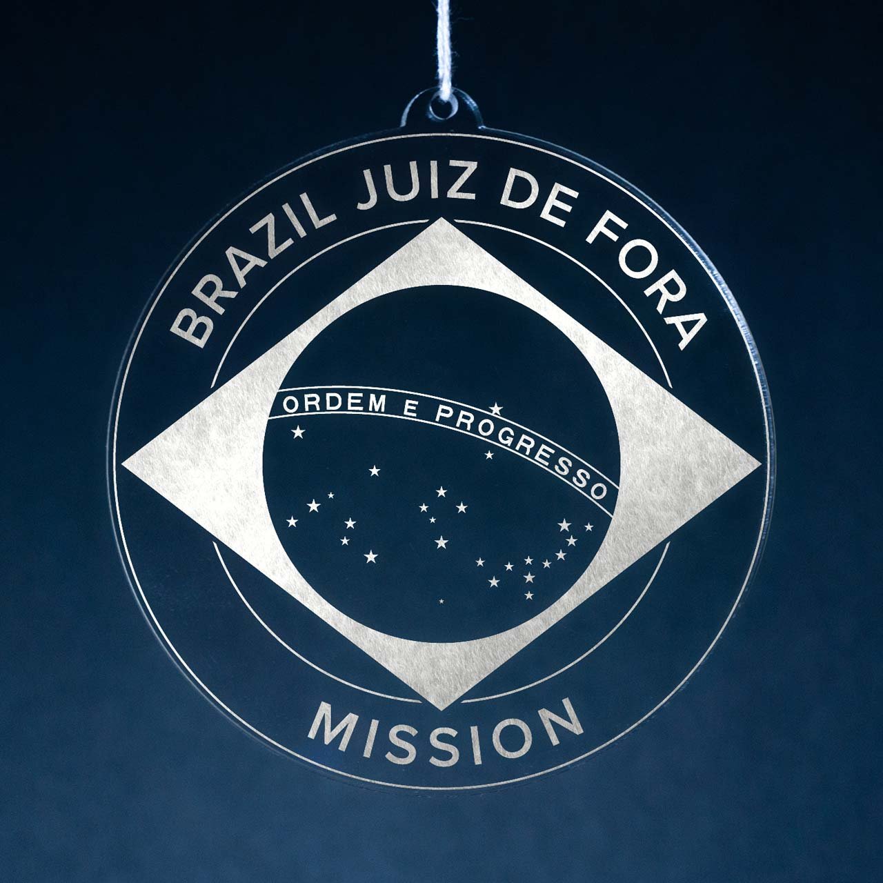The design on this ornament is inspired by the Brazilian Flag and depicts a starry sky spanned by a curved band inscribed with the national motto "Ordem e Progresso" ("Order and Progress" in Portuguese). Each of the stars represents a Brazilian state and the Federal District, their size is proportion relative to its geographic size. The 27 stars compose nine constellations that are present in the sky of Rio de Janeiro in winter, the capital of the country.