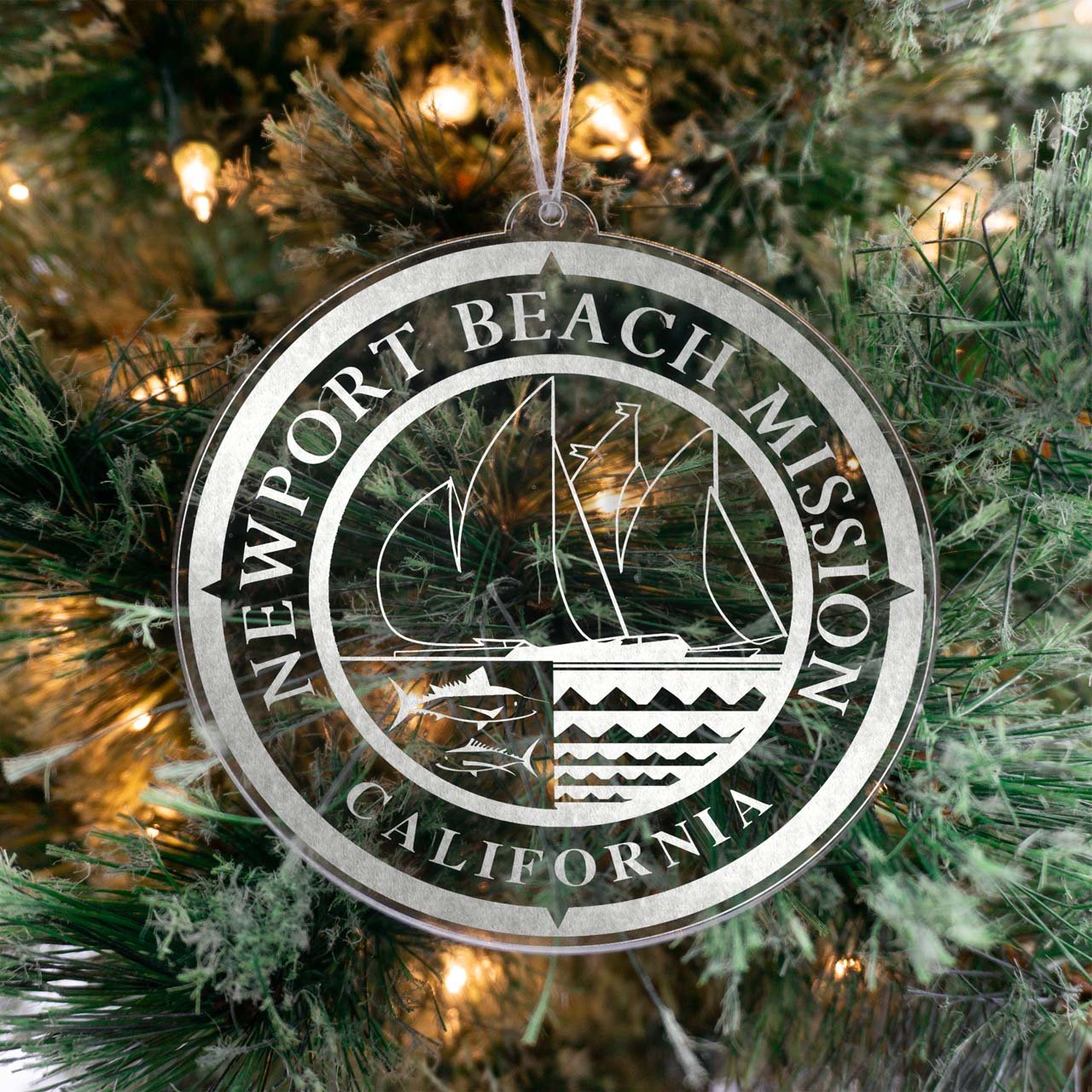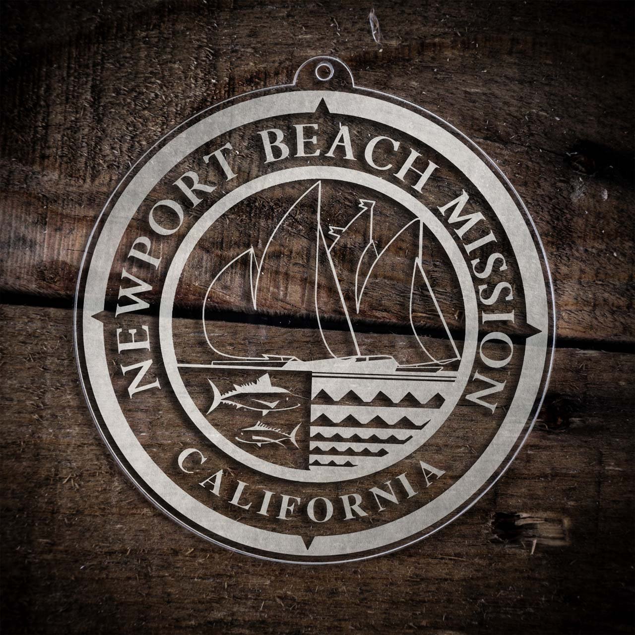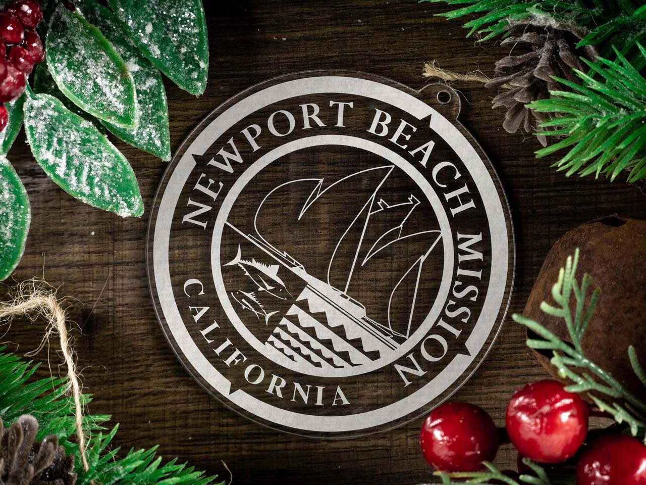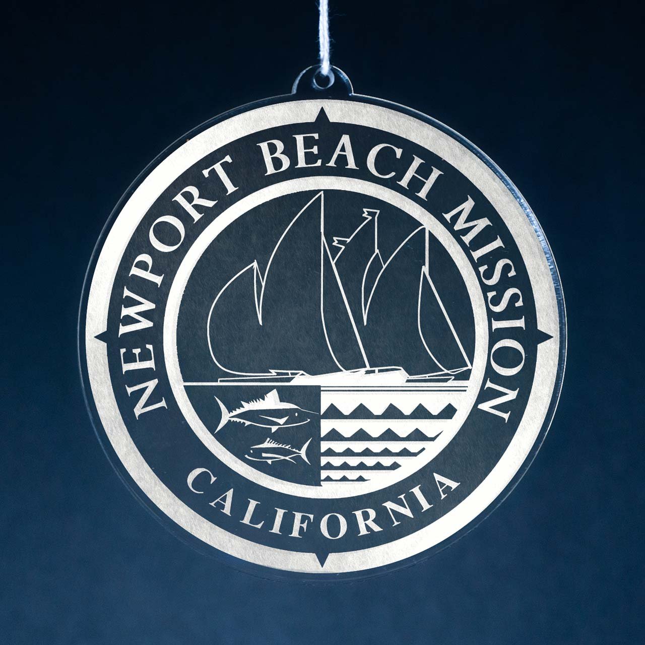 The design on this ornament is inspired by the Official City Seal of Newport and celebrates the recreational boating industry and its origins as a fishing village. The outer circle surrounding the seal suggests the four cardinal points of the compass which encompasses the whole as a nautical theme.