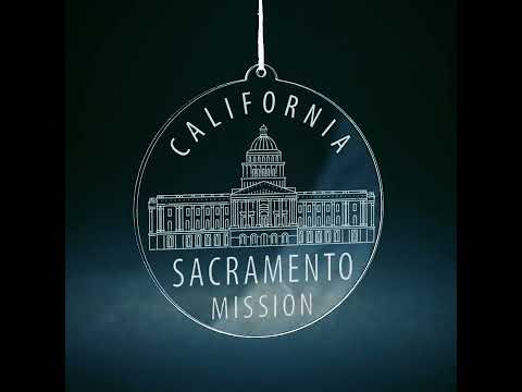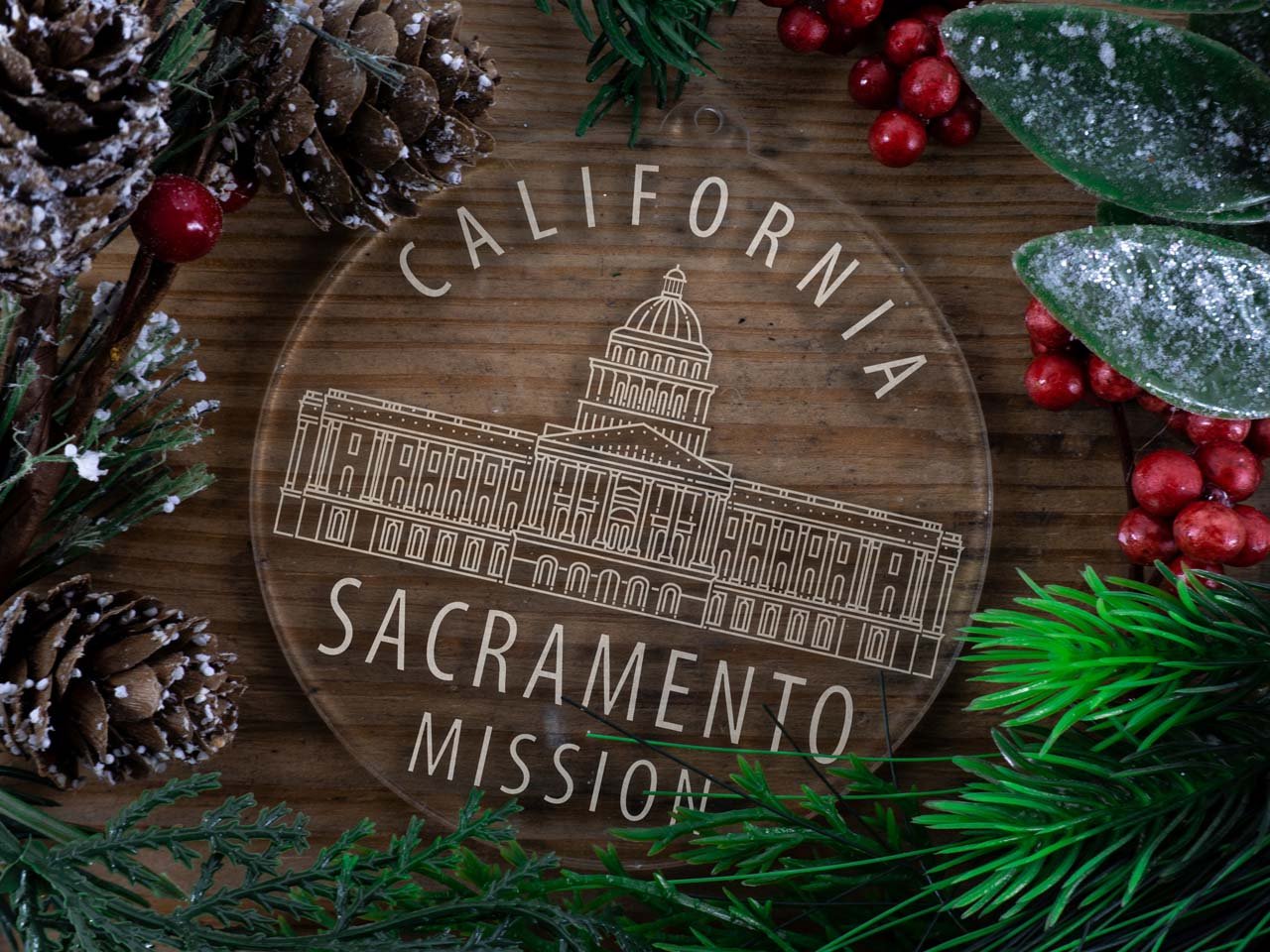 The design on this ornament celebrates the city's status as the capital of California by featuring the capital building in the center of the piece.