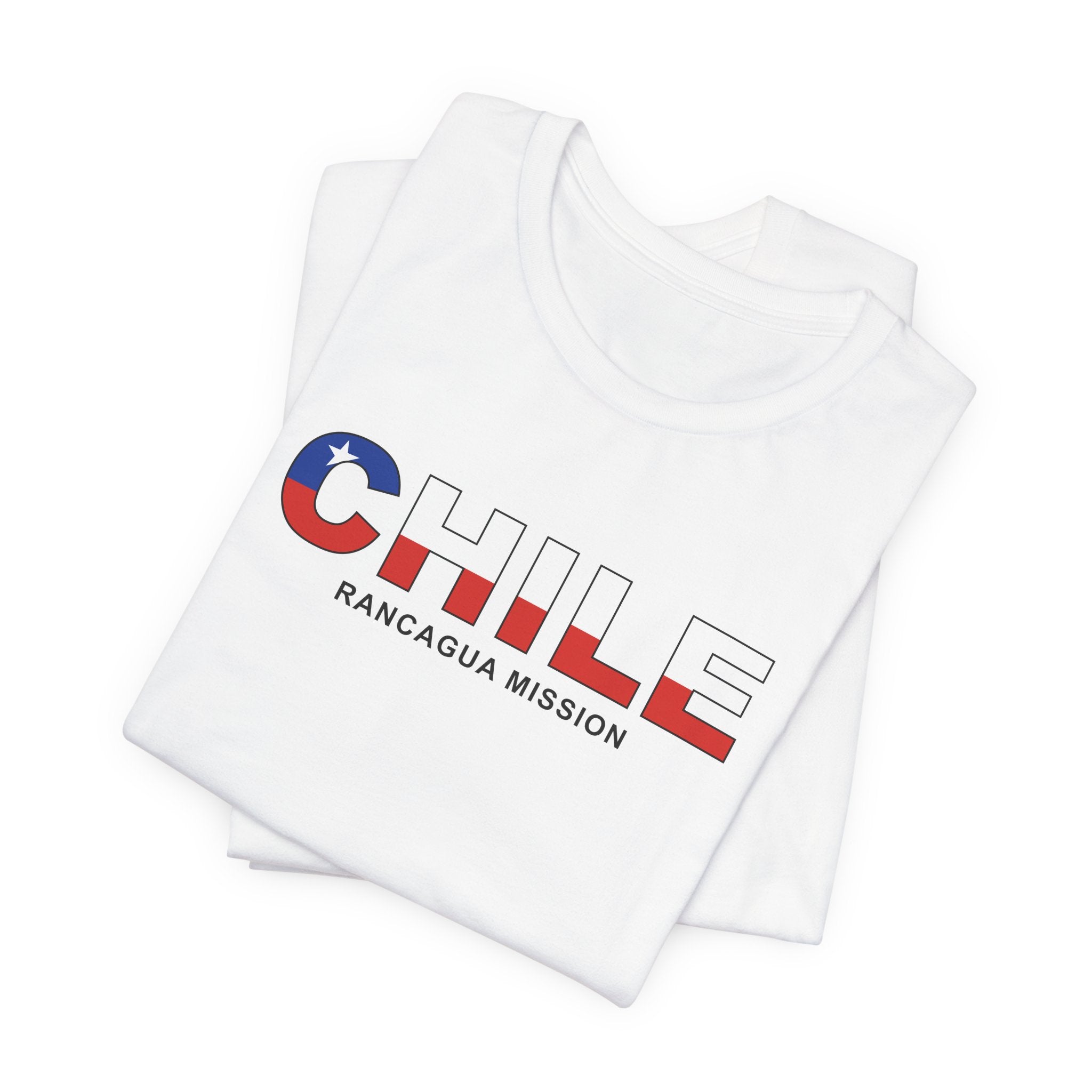 What sets this t-shirt apart is its unique design element: it features the flag of Chile neatly superimposed over the Chile Rancagua Mission's name. This striking visual not only adds a vibrant splash of color to the design but also symbolizes the missions unity and commitment to the regions community. The flag's intricate details are carefully rendered to ensure clarity and impact, making this t-shirt a standout piece in any wardrobe.