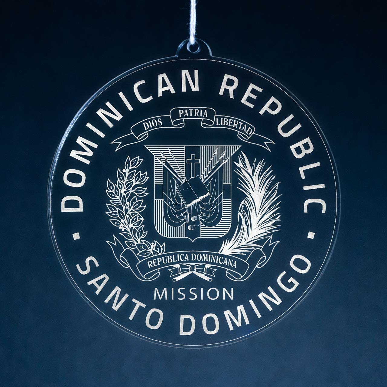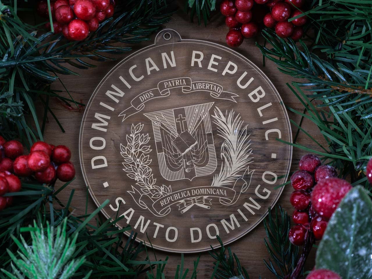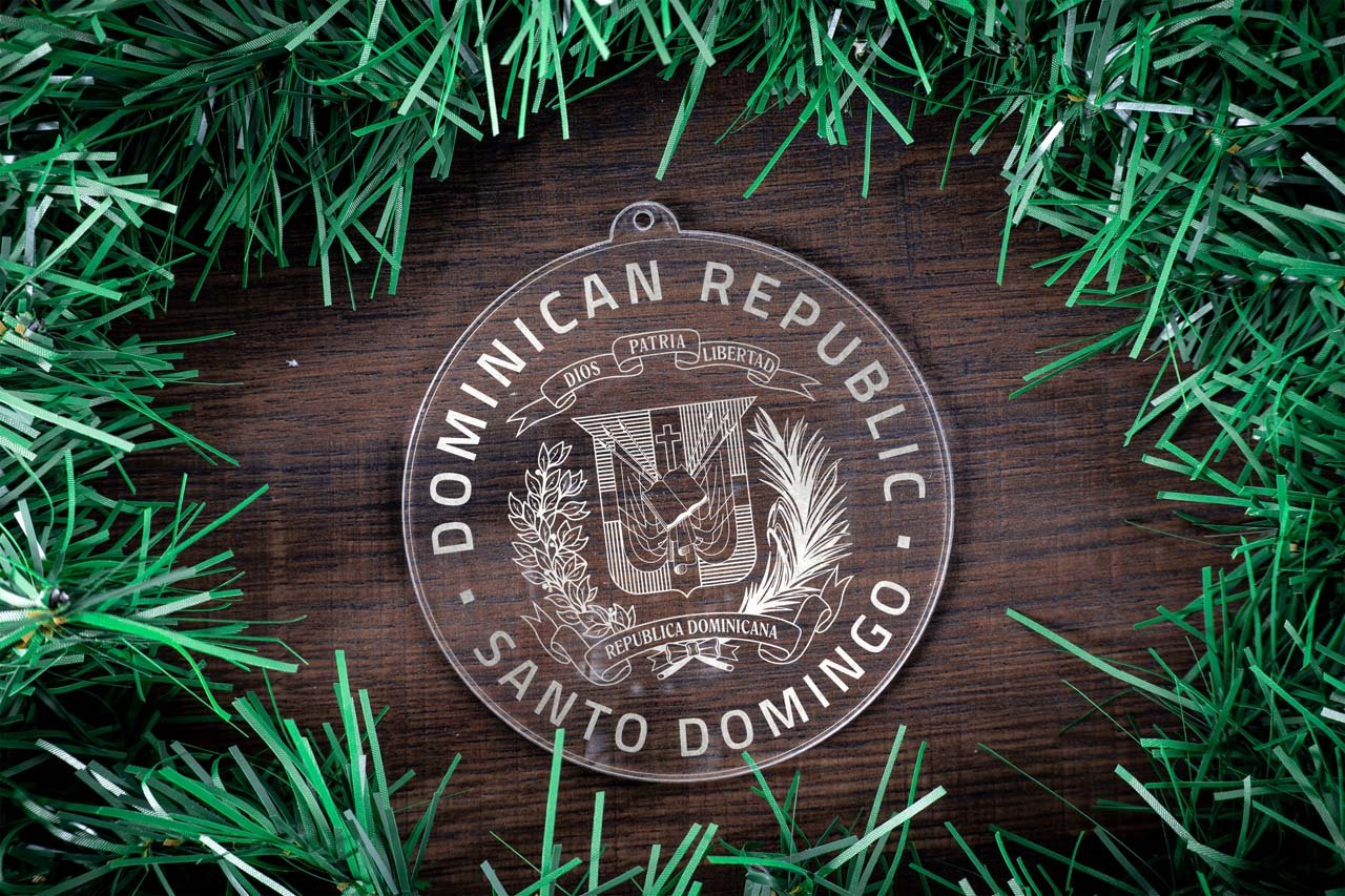 The design on this ornament is inspired by the Flag of the Dominican Republic which includes its Coat of Arms. features a shield in similarly quartered colors as the flag, supported by a bay laurel branch on the left and a palm frond on the right; above the shield, a blue ribbon displays the national motto: Dios, Patria, Libertad (God, Homeland, Liberty). Below the shield, the words República Dominicana appear on a red ribbon. In the center of the shield, flanked by six spears (three on each side), the front four holding the national flag, is a Bible with a small golden cross above it.