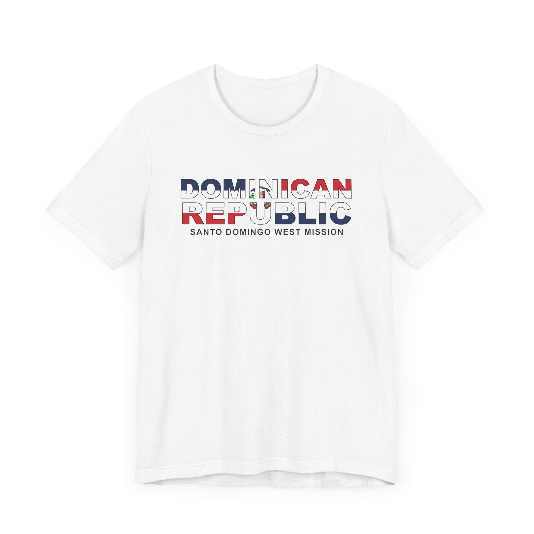What sets this t-shirt apart is its unique design element: it features the flag of Dominican Republic neatly superimposed over the Dominican Republic Santo Domingo West Mission's name. This striking visual not only adds a vibrant splash of color to the design but also symbolizes the missions unity and commitment to the regions community. The flag's intricate details are carefully rendered to ensure clarity and impact, making this t-shirt a standout piece in any wardrobe.