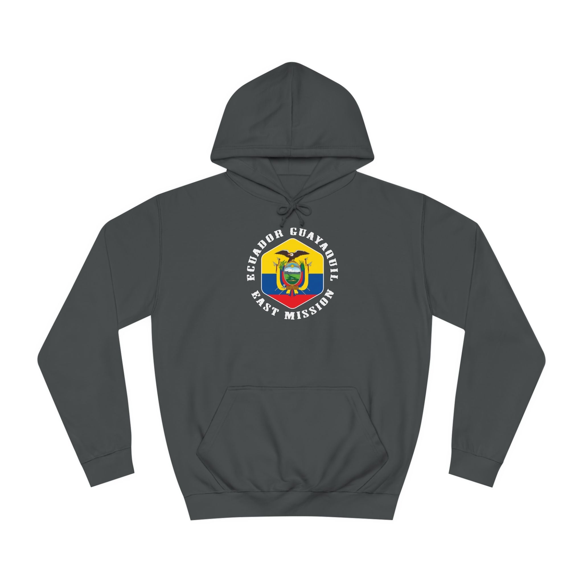 Stay warm and express your faith with our cozy Ecuador Guayaquil East Mission Flag Logo (Black Border) College Hoodie. This hoodie features a unisex design with side seams that help the garment retain its shape in the long run. With a spacious kangaroo pocket for enhanced daily practicality, a comfy true-to-size fit, and multiple colors to choose from, these hoodies provide a comfortable wearing experience packed with style.
