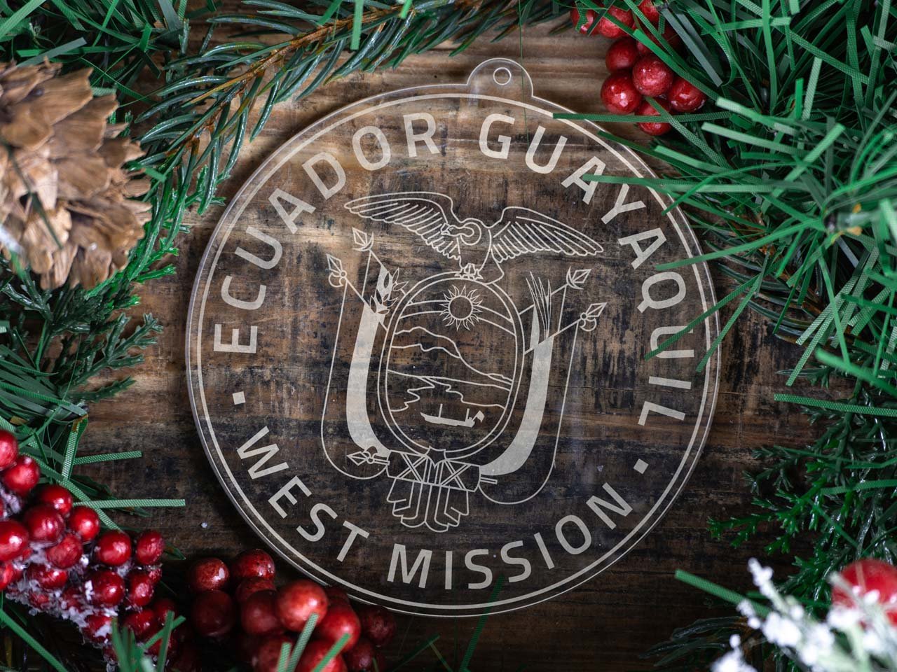 Made out of a lightweight and very durable transparent acrylic, these ornaments will not weigh your tree down and can definitely withstand being dropped by the little ones should they get too curious around the tree. The acrylic is cut into a 4 inch circle and then laser etched with the name of the mission and graphics inspired by the region served.