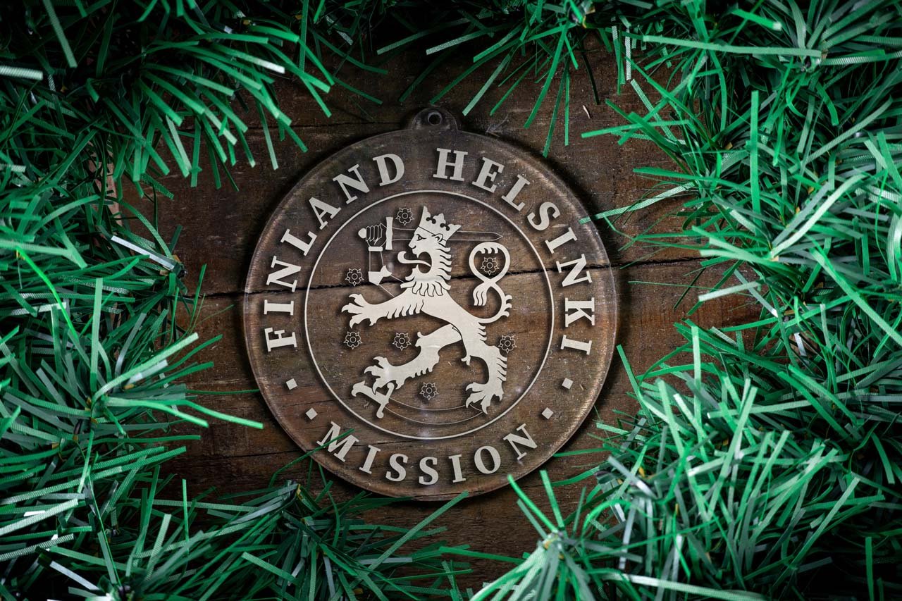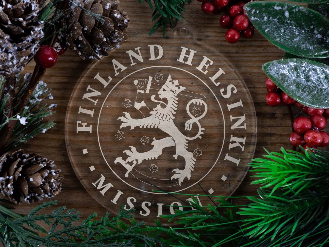 The design on this ornament is inspired by the Coat of Arms of Finland which features a crowned lion on a shield, with the right foreleg replaced with an armoured human arm brandishing a sword, trampling on a sabre with the hindpaws. The coat of arms was originally created around the year 1580. The heraldic lion is quite common in Western Europe, and several European countries incorporate it into their national coats of arms.