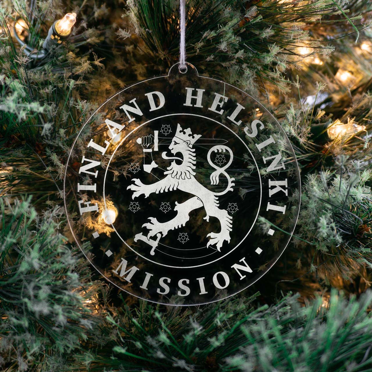 Made out of a lightweight and very durable transparent acrylic, these ornaments will not weigh your tree down and can definitely withstand being dropped by the little ones should they get too curious around the tree. The acrylic is cut into a 4 inch circle and then laser etched with the name of the mission and graphics inspired by the region served.
