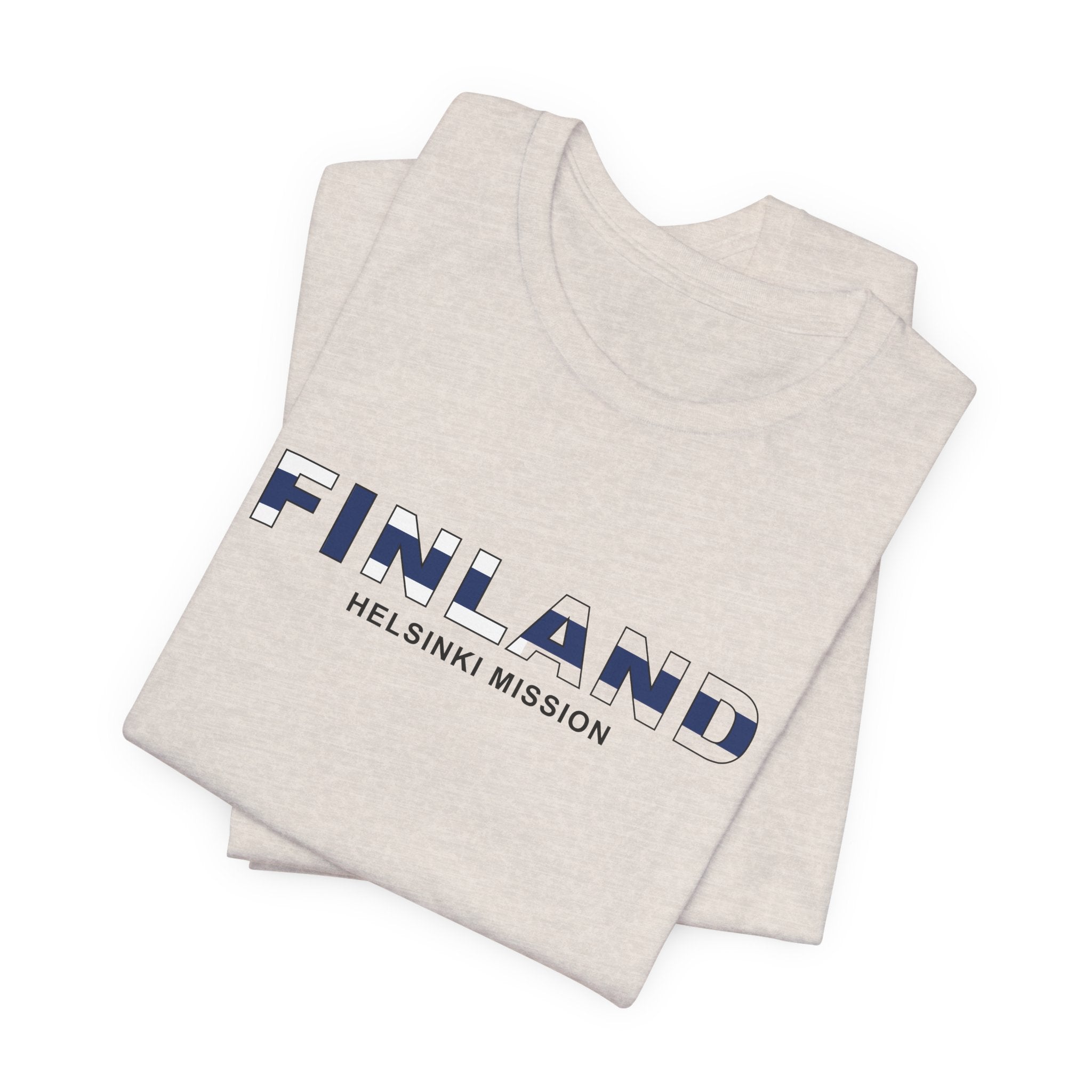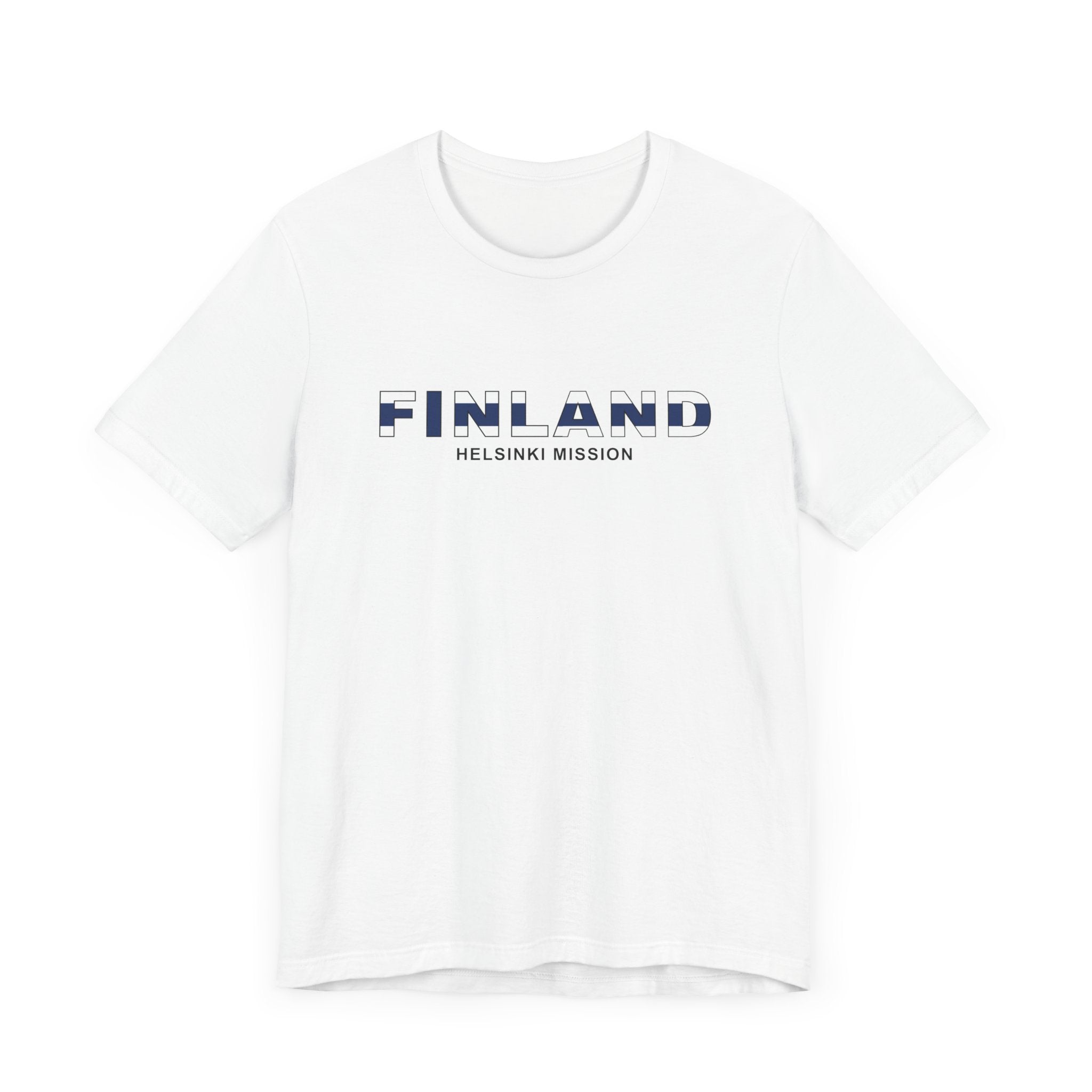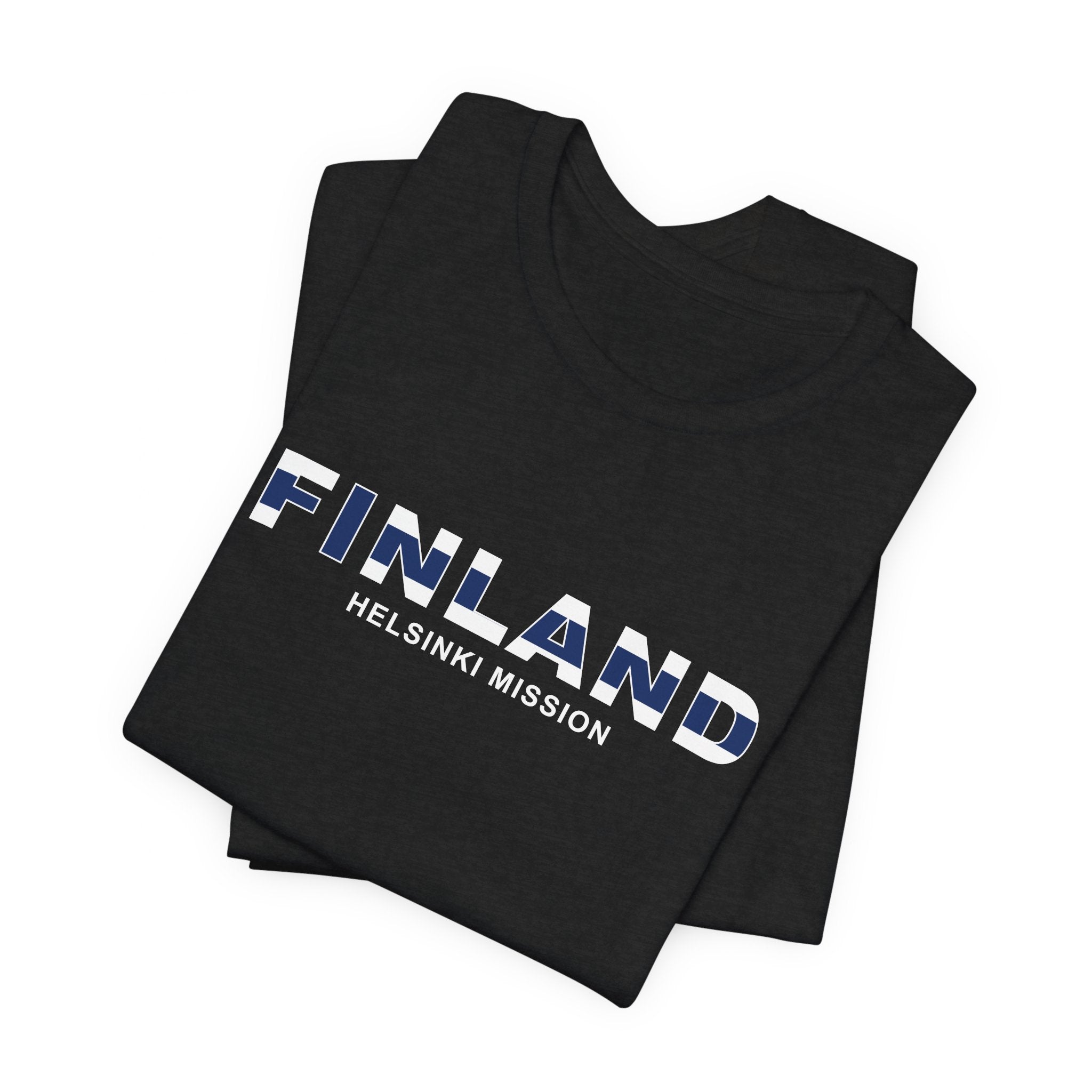 What sets this t-shirt apart is its unique design element: it features the flag of neatly superimposed over the Finland Helsinki Mission's name. This striking visual not only adds a vibrant splash of color to the design but also symbolizes the missions unity and commitment to the regions community. The flag's intricate details are carefully rendered to ensure clarity and impact, making this t-shirt a standout piece in any wardrobe.
