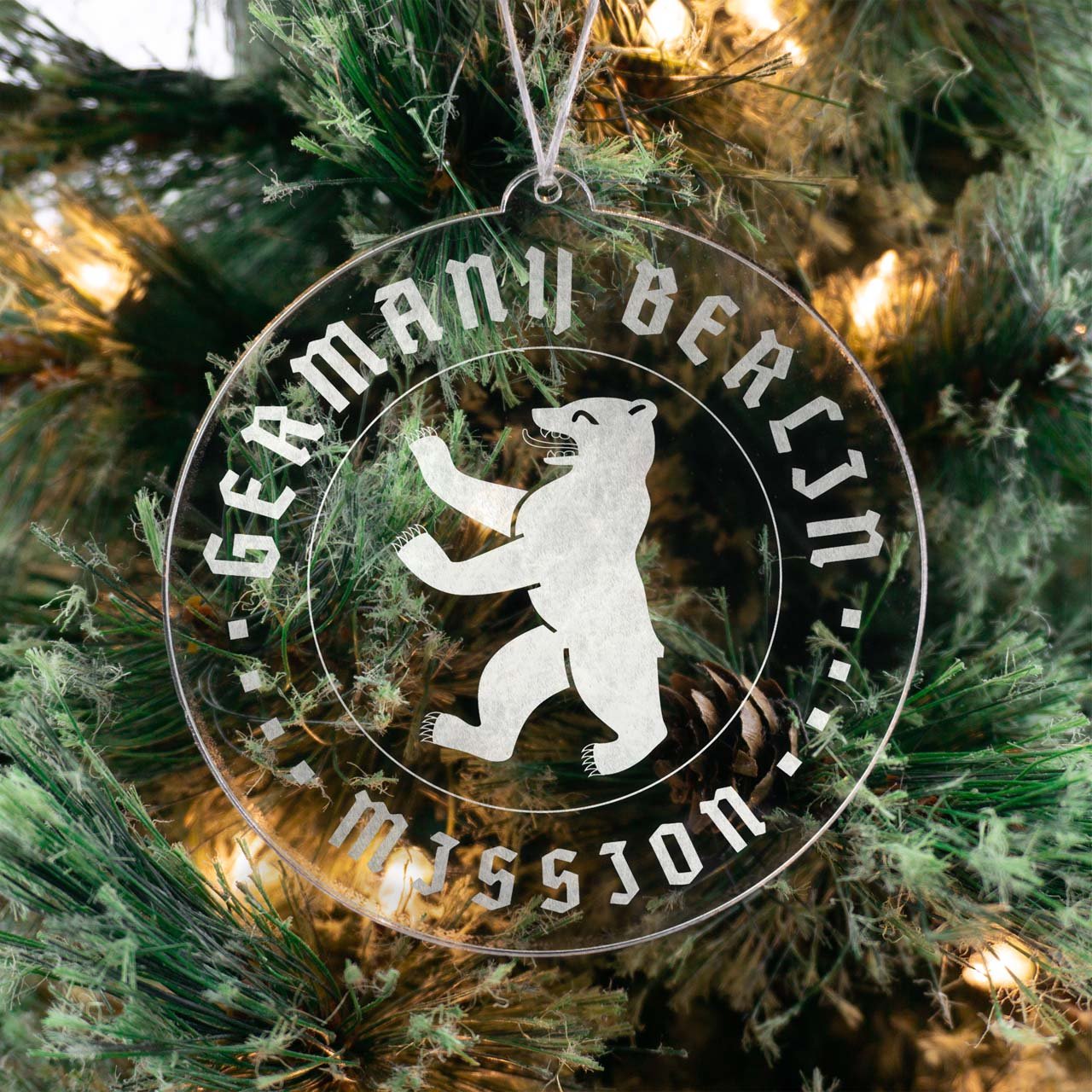 Made out of a lightweight and very durable transparent acrylic, these ornaments will not weigh your tree down and can definitely withstand being dropped by the little ones should they get too curious around the tree. The acrylic is cut into a 4 inch circle and then laser etched with the name of the mission and graphics inspired by the region served.