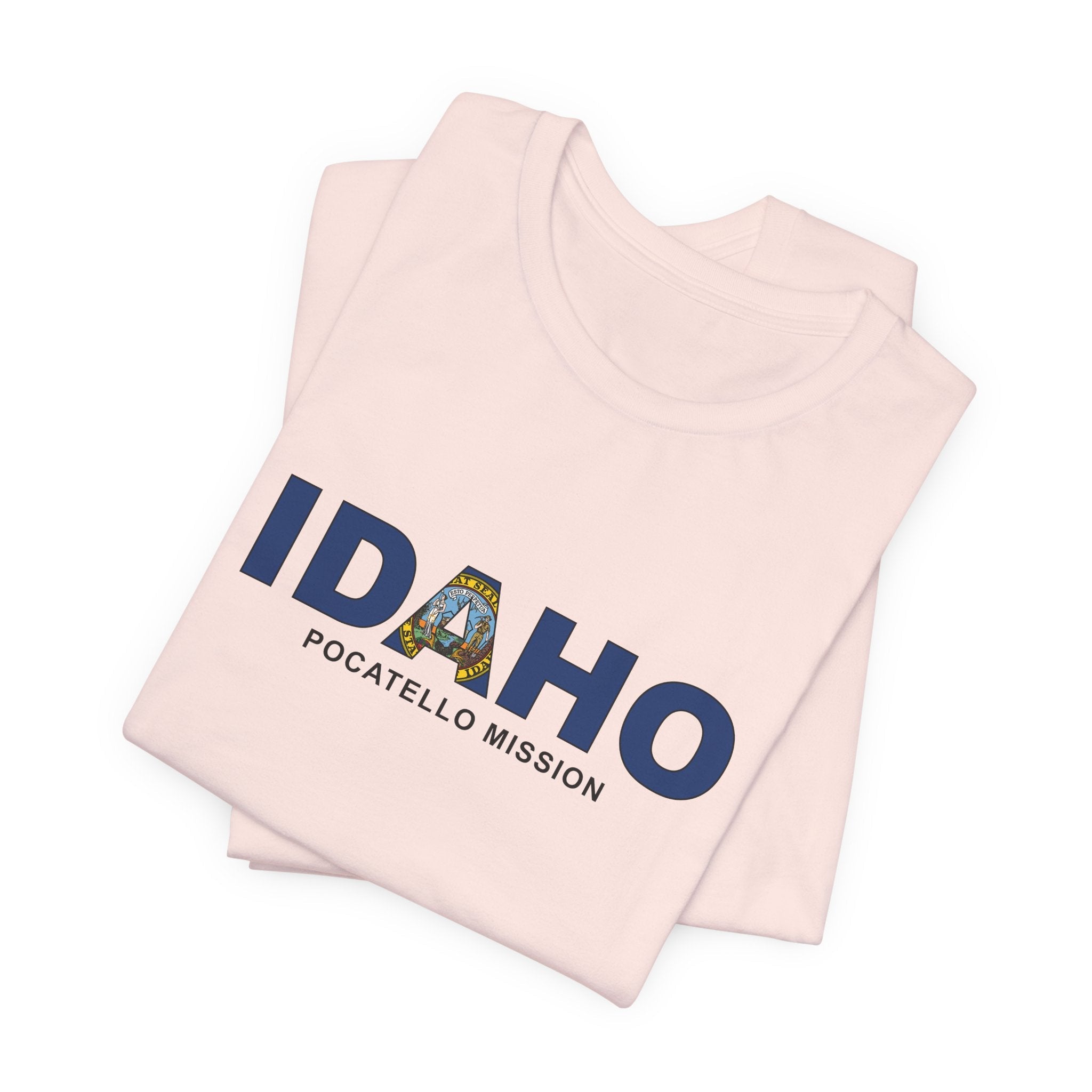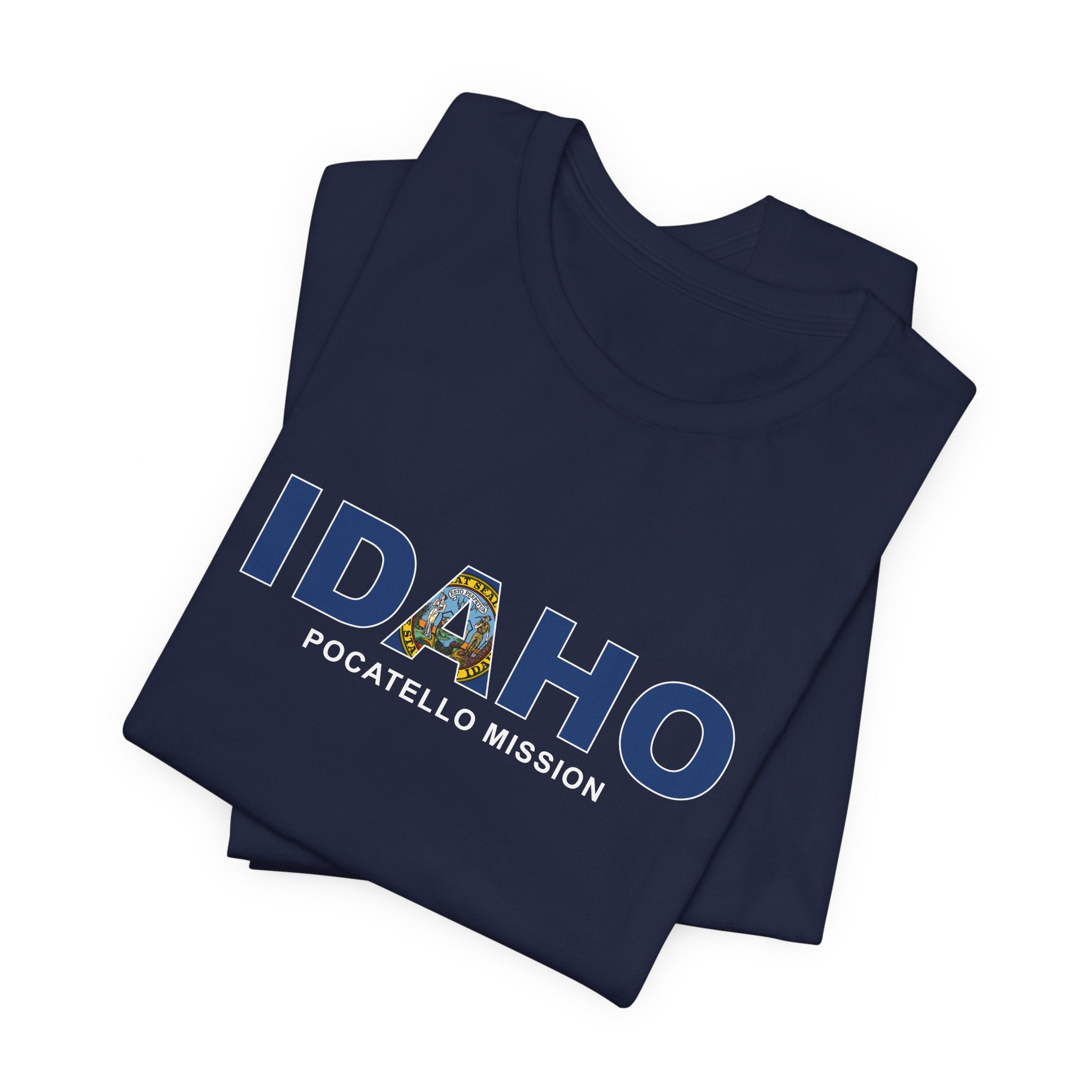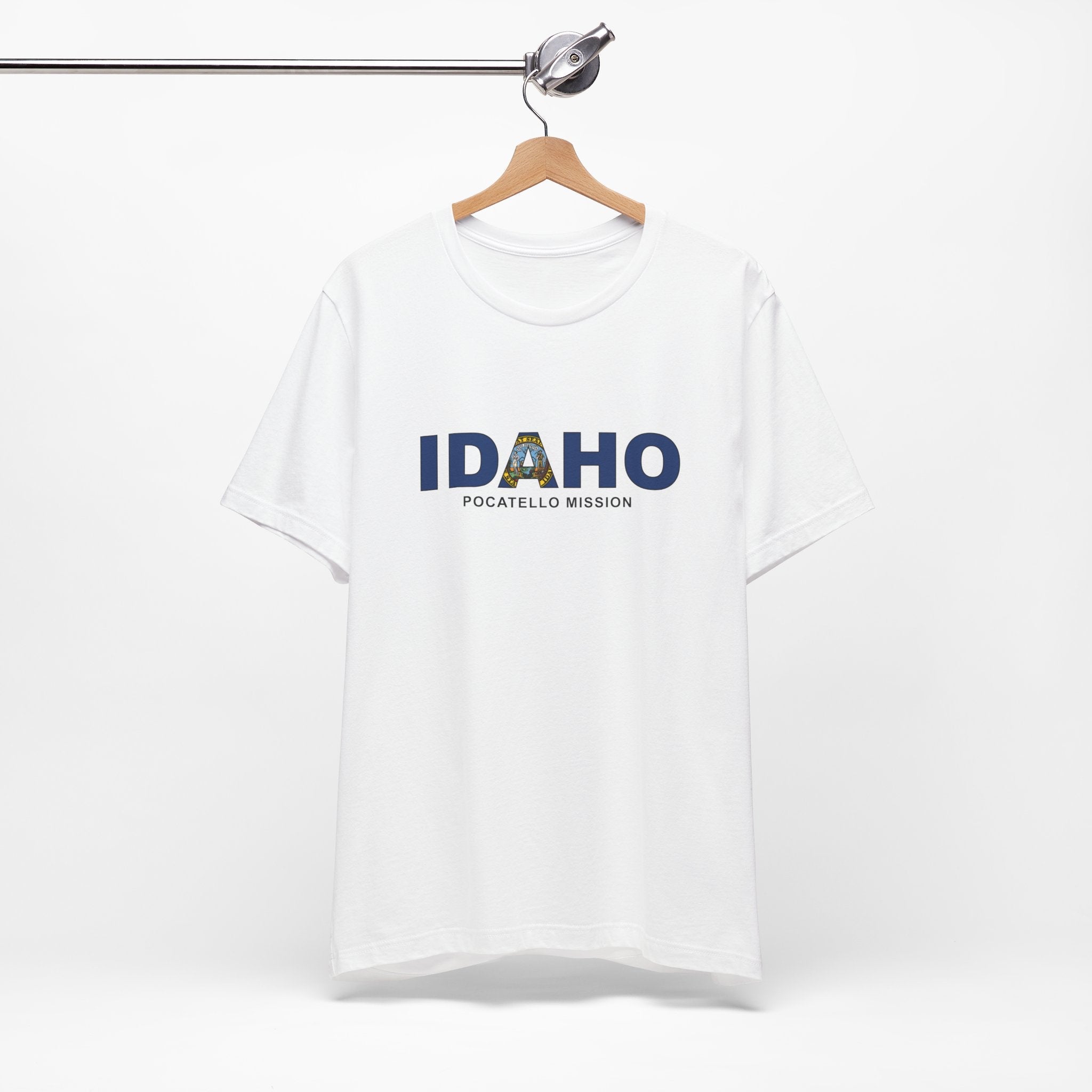 What sets this t-shirt apart is its unique design element: it features the flag of US neatly superimposed over the Idaho Pocatello Mission's name. This striking visual not only adds a vibrant splash of color to the design but also symbolizes the missions unity and commitment to the regions community. The flag's intricate details are carefully rendered to ensure clarity and impact, making this t-shirt a standout piece in any wardrobe.