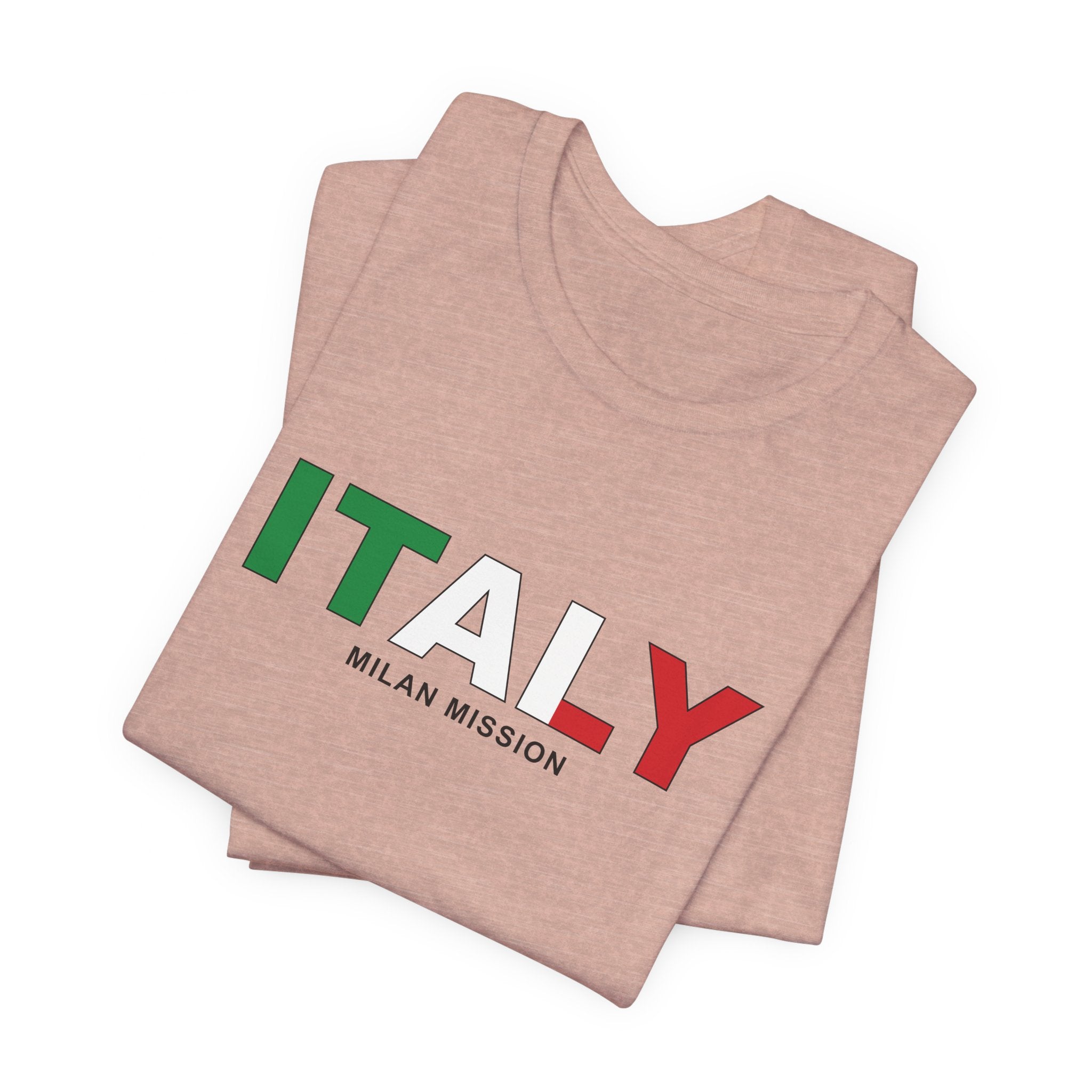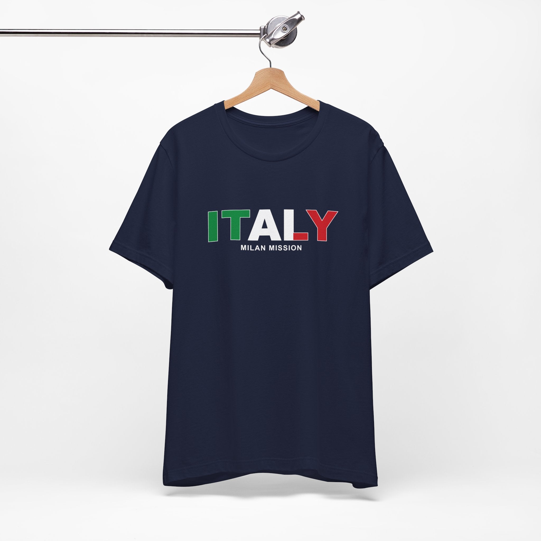 What sets this t-shirt apart is its unique design element: it features the flag of neatly superimposed over the Italy Milan Mission's name. This striking visual not only adds a vibrant splash of color to the design but also symbolizes the missions unity and commitment to the regions community. The flag's intricate details are carefully rendered to ensure clarity and impact, making this t-shirt a standout piece in any wardrobe.