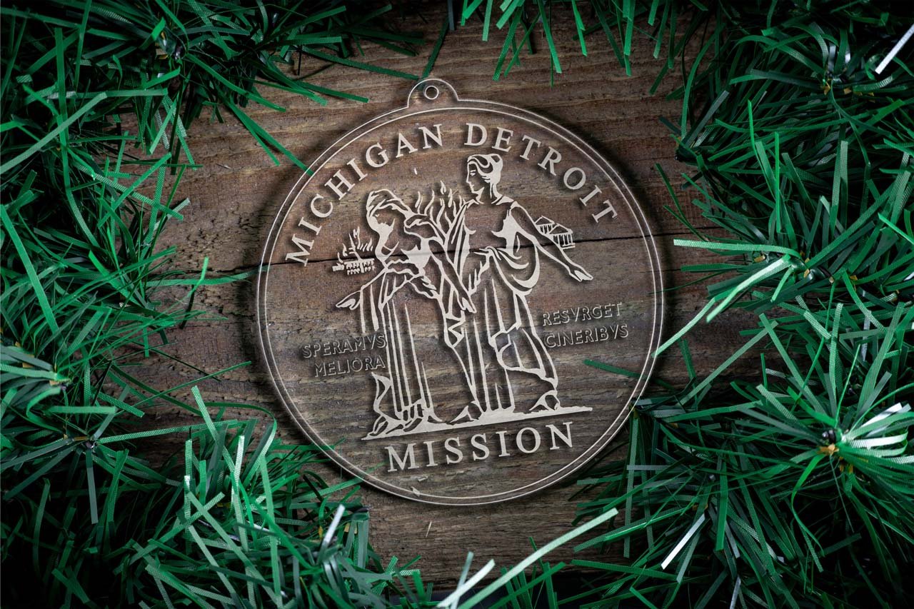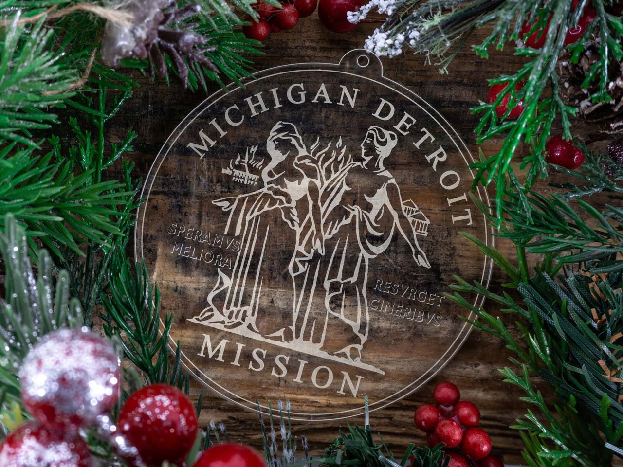 The design on this ornament is inspired by the flag of the City of Detroit which depicts two figures morning the Detroit fire of 1805, an event that caused the entire city to burn with only one building saved from the flames. The figure on the left weeps over the destruction while the figure on the right gestures to the new city that will rise in its place. Beside them are two latin mottos stating: "We hope for better things" and "It will rise from the ashes".