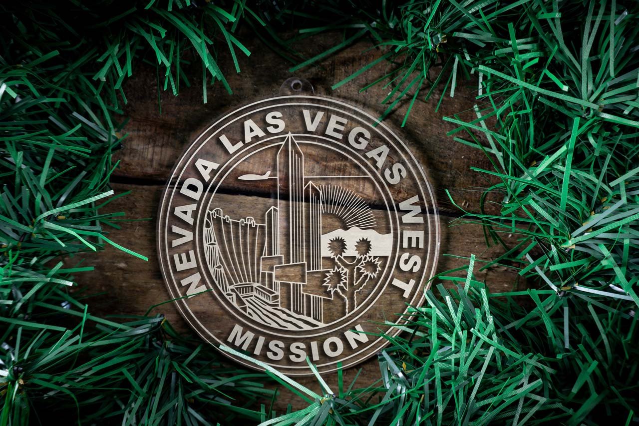 The design on this ornament is inspired by the City Seal of Las Vegas which depicts three buildings in the center (representing the cities reliance on tourism) surrounded by the Hoover Dam on the left, Sunrise Mountain on the right and the Colorado river below. Included below the mountain is a four-limbed Joshua tree, a reference to the desert landscape of the area and above the dam is jet followed by ontrail alludes to the importance of air traffic, both civilian and military, in the region.