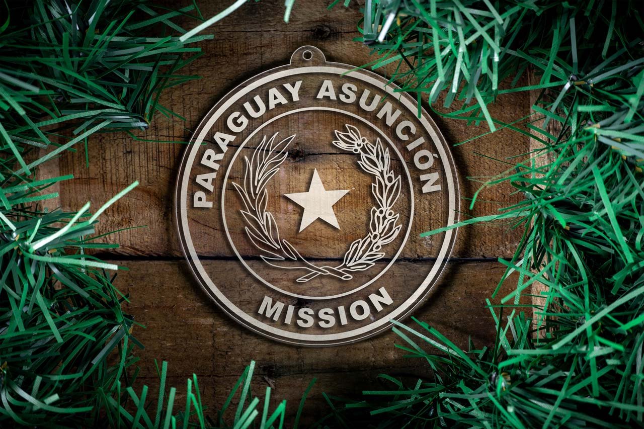 The design on this ornament is inspired by the Coat of Arms on the Paraguay national flag. It lies in the white center section on the flag and features a round background a five-pointed star surrounded by a palm branch to the left and an olive branch to the right, both tied together below the star.