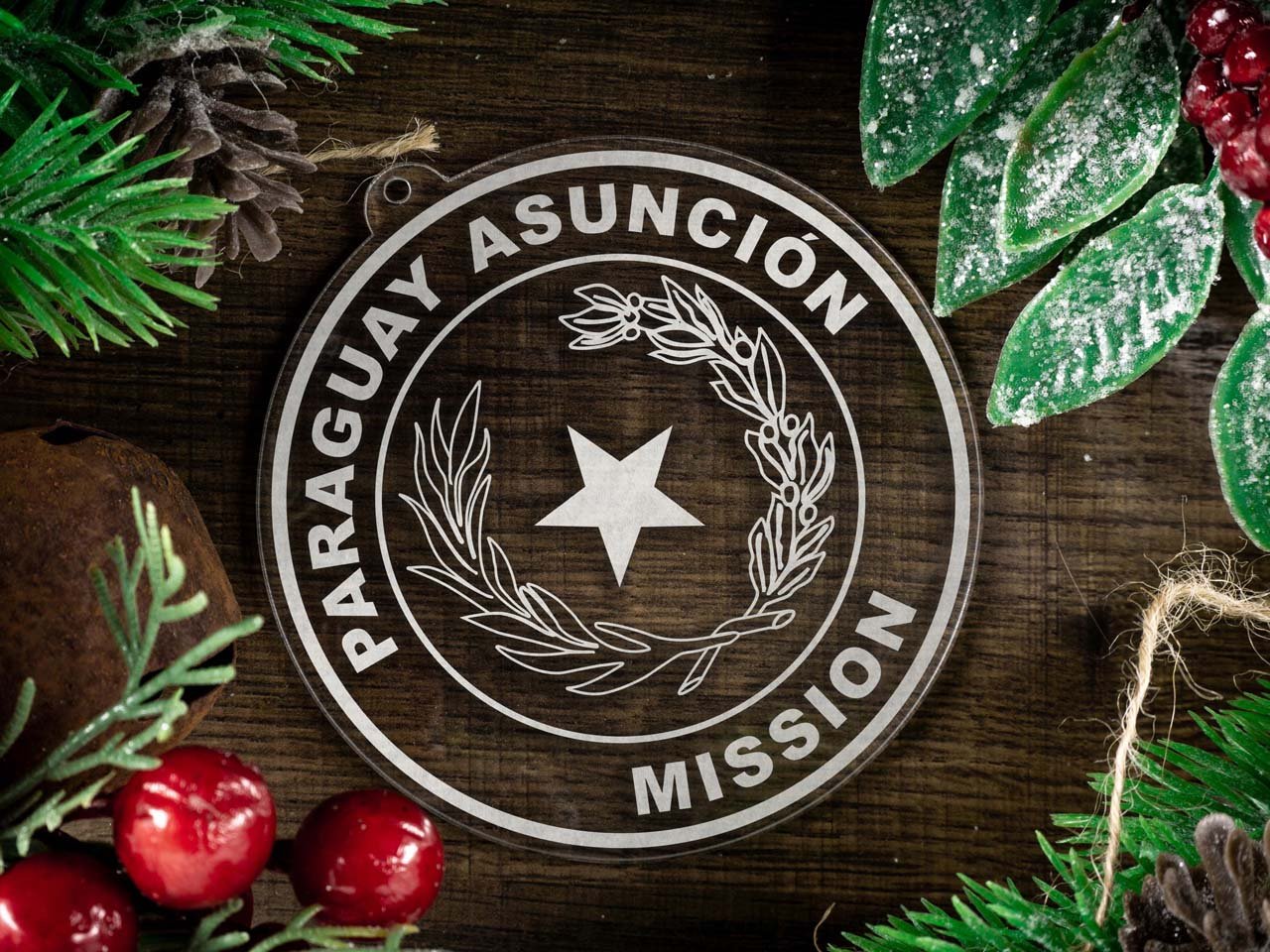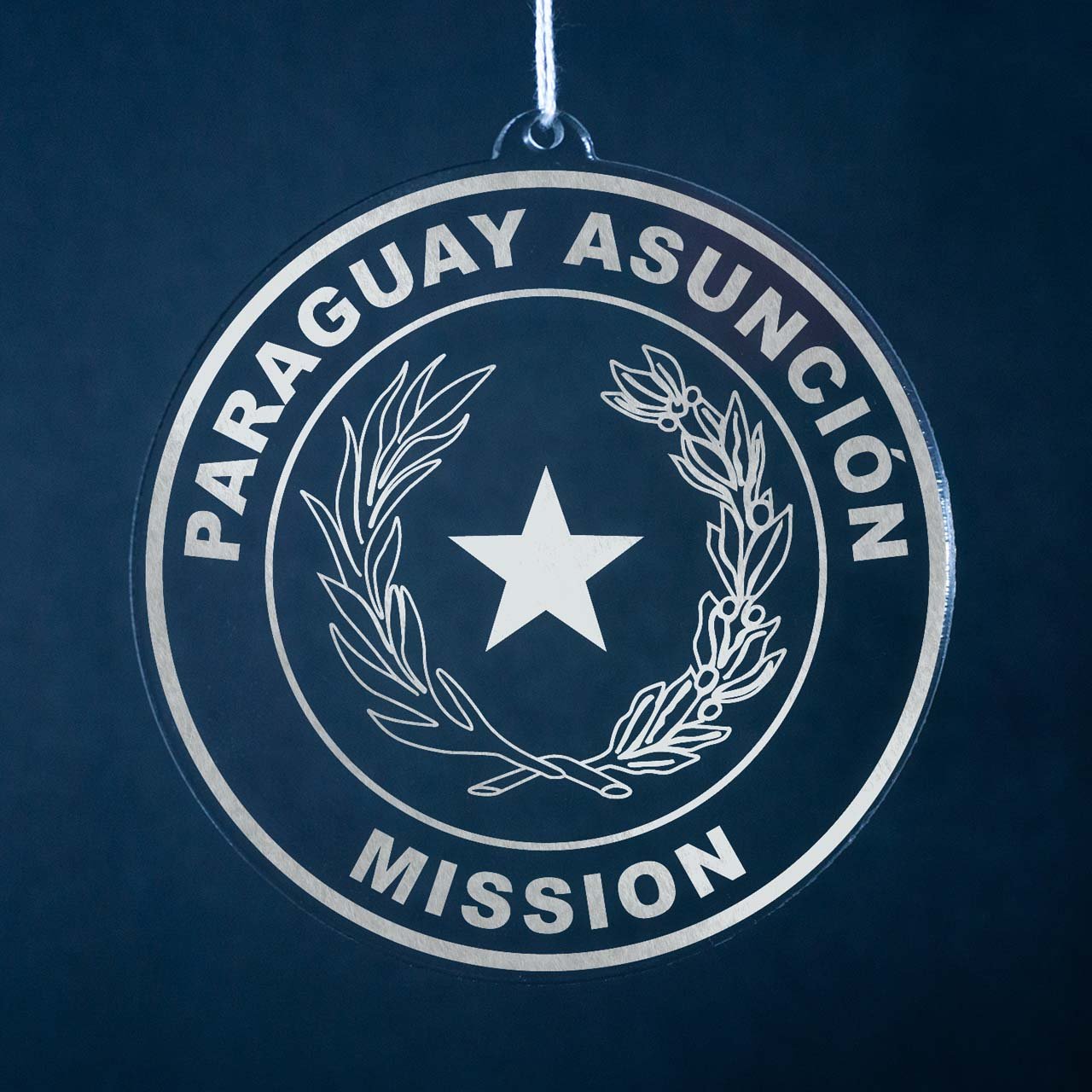 Made out of a lightweight and very durable transparent acrylic, these ornaments will not weigh your tree down and can definitely withstand being dropped by the little ones should they get too curious around the tree. The acrylic is cut into a 4 inch circle and then laser etched with the name of the mission and graphics inspired by the region served.