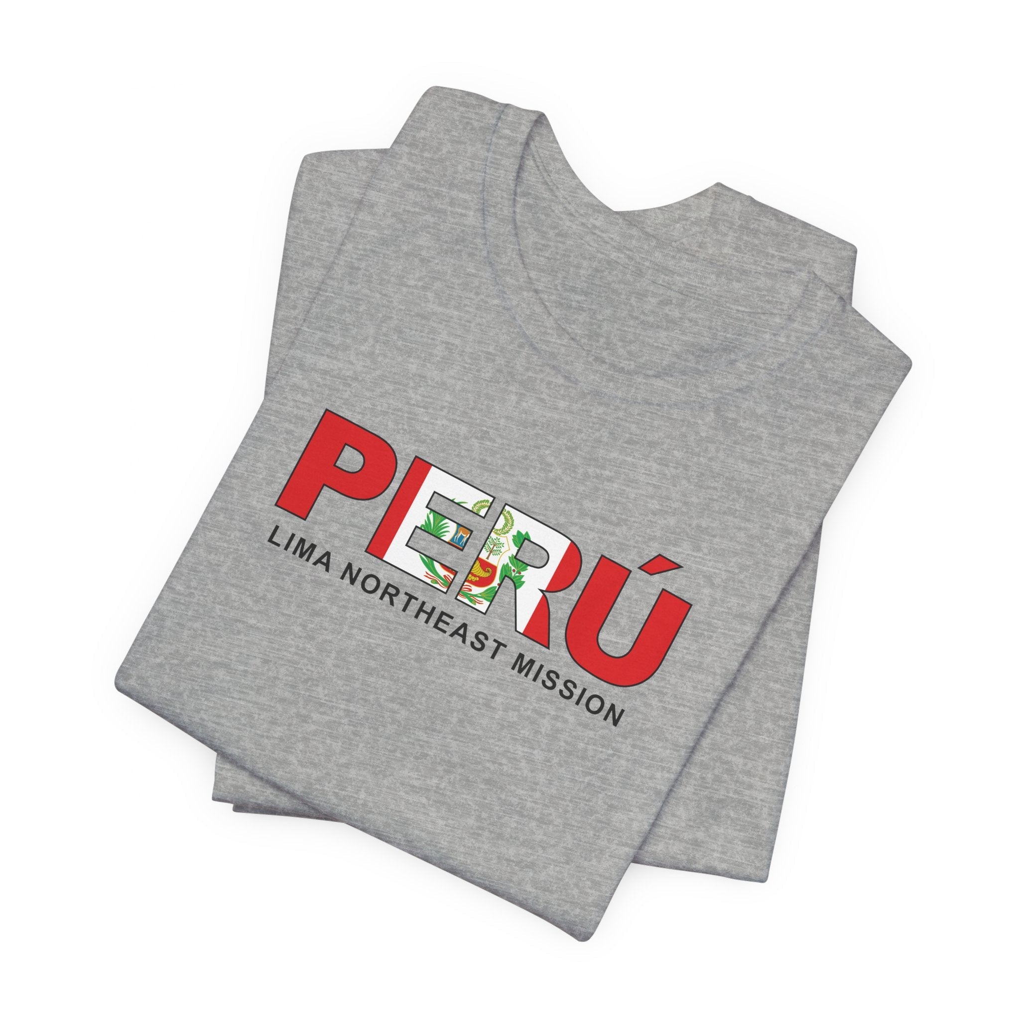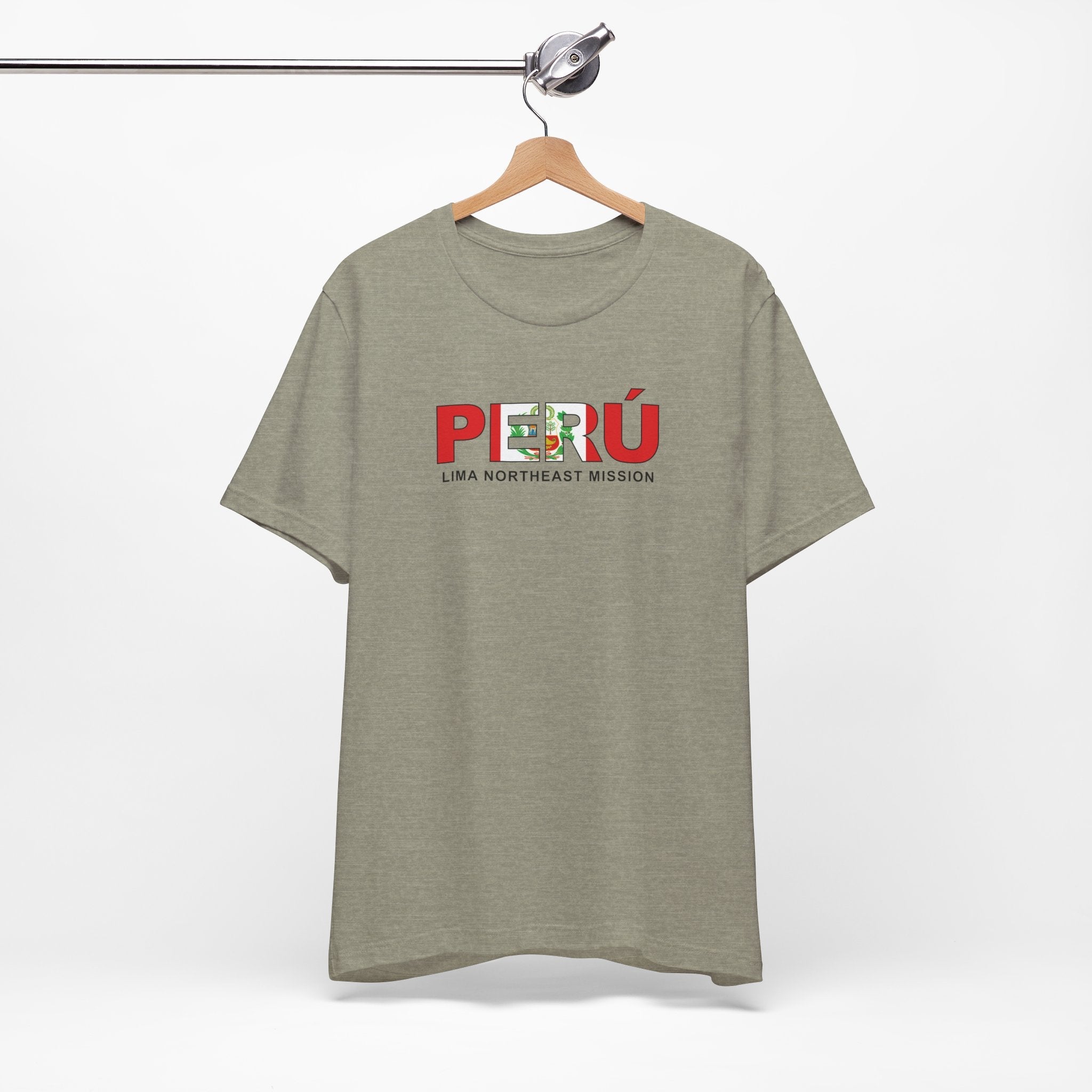 What sets this t-shirt apart is its unique design element: it features the flag of Perú neatly superimposed over the Peru Lima Northeast Mission's name. This striking visual not only adds a vibrant splash of color to the design but also symbolizes the missions unity and commitment to the regions community. The flag's intricate details are carefully rendered to ensure clarity and impact, making this t-shirt a standout piece in any wardrobe.