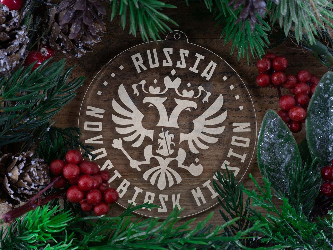 The design on this ornament is inspired by the Coat of Arms of Russia which predominantly features a Double-Headed Eagle, a symbol directly derived from Russia's medieval origins and officially adopted after the Fall of Constantinople.