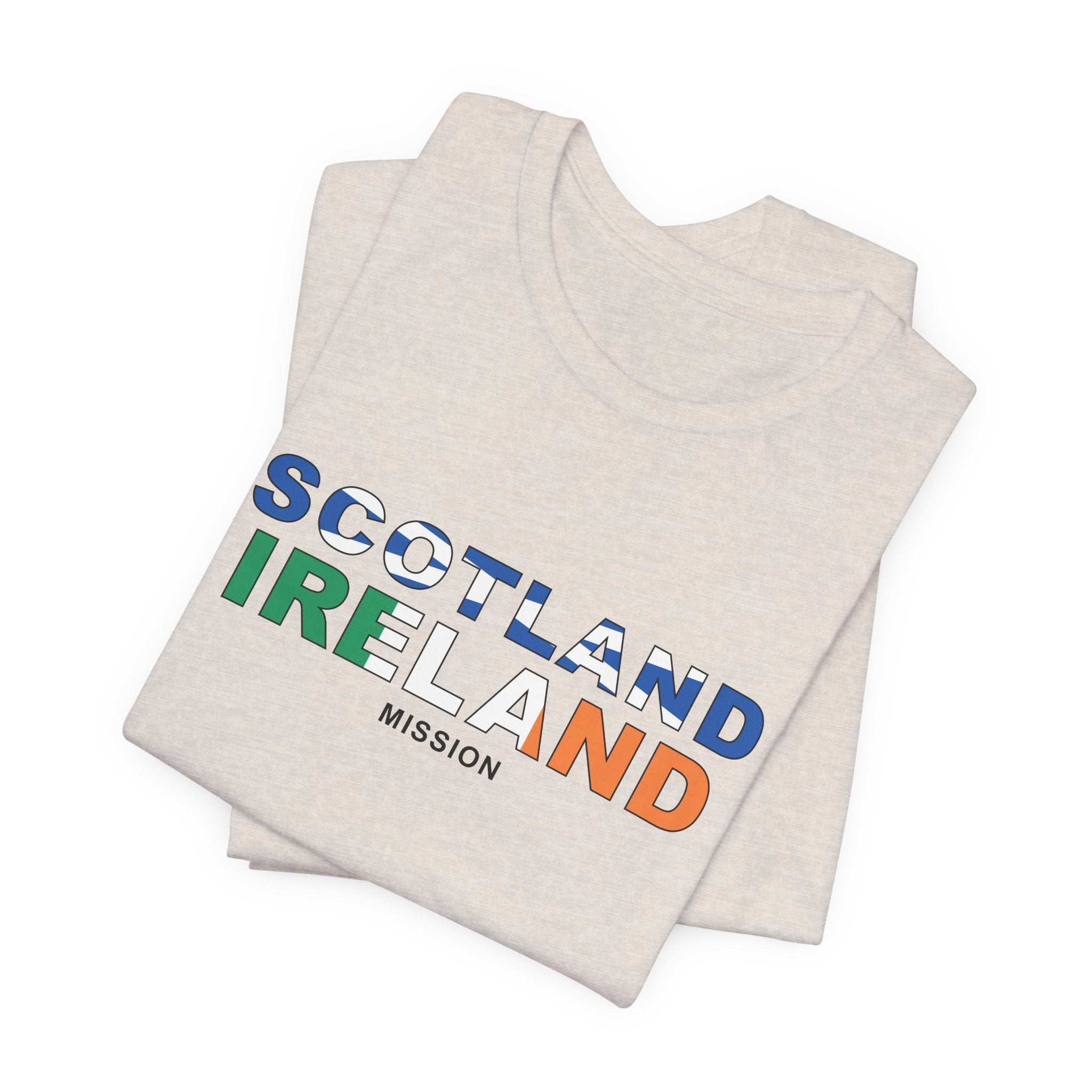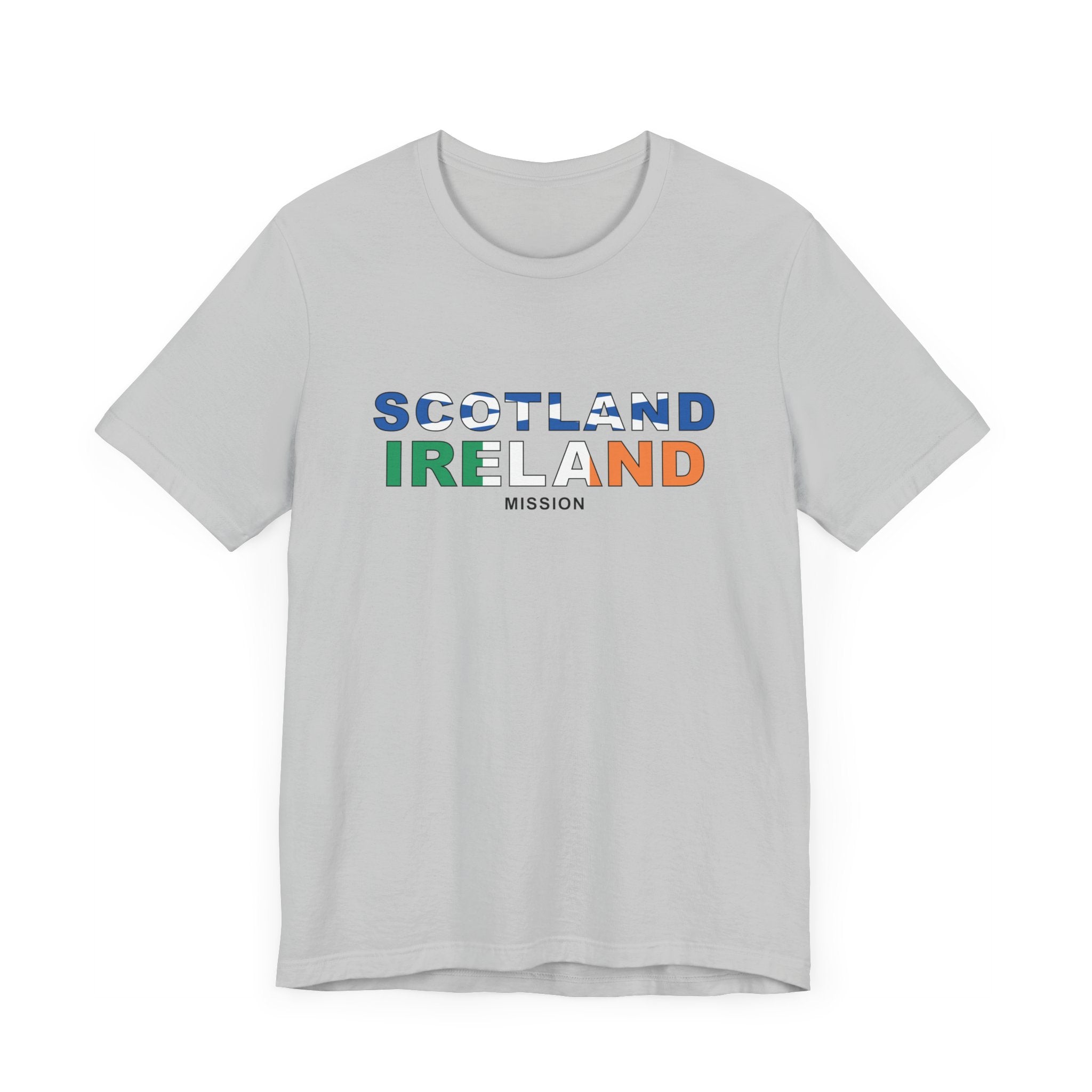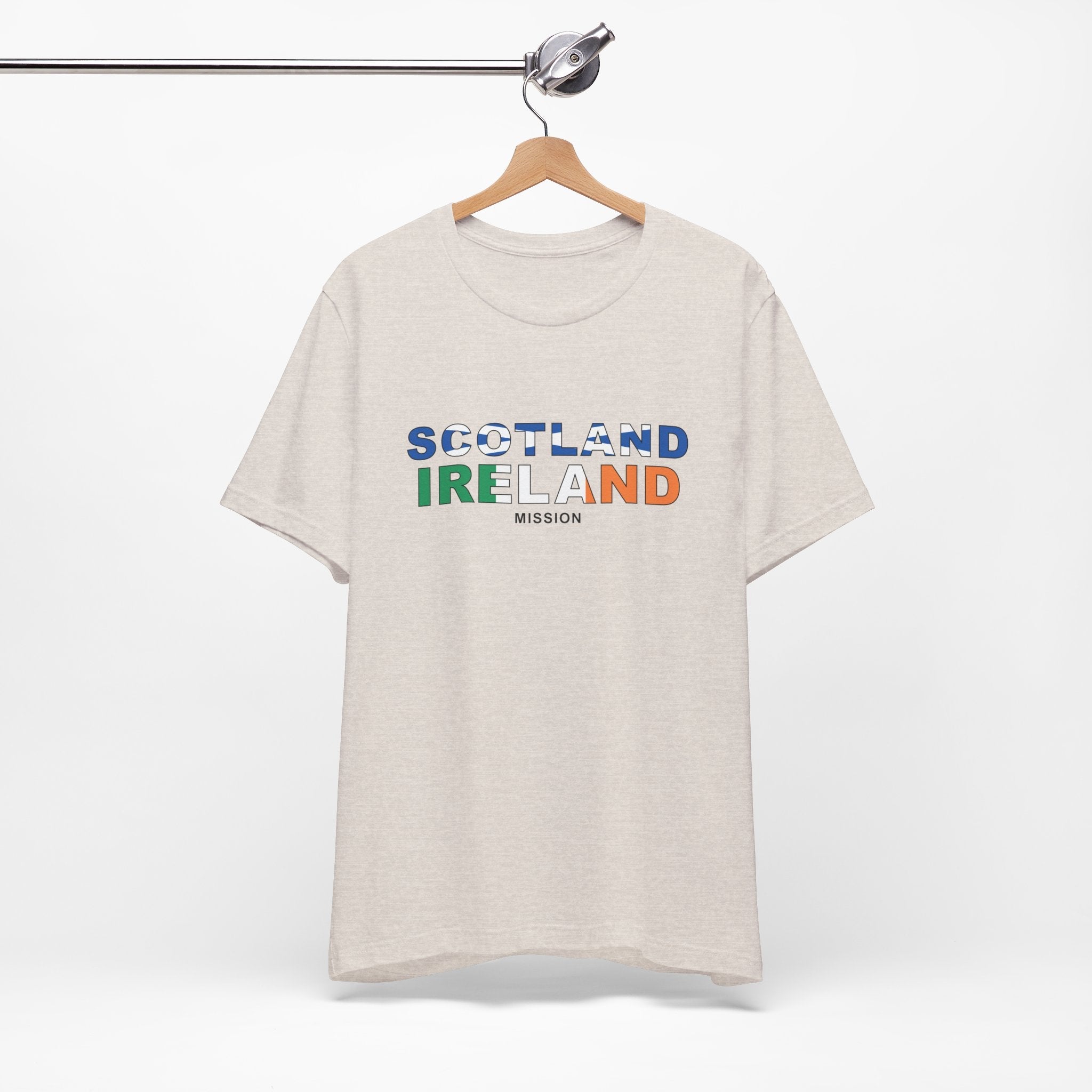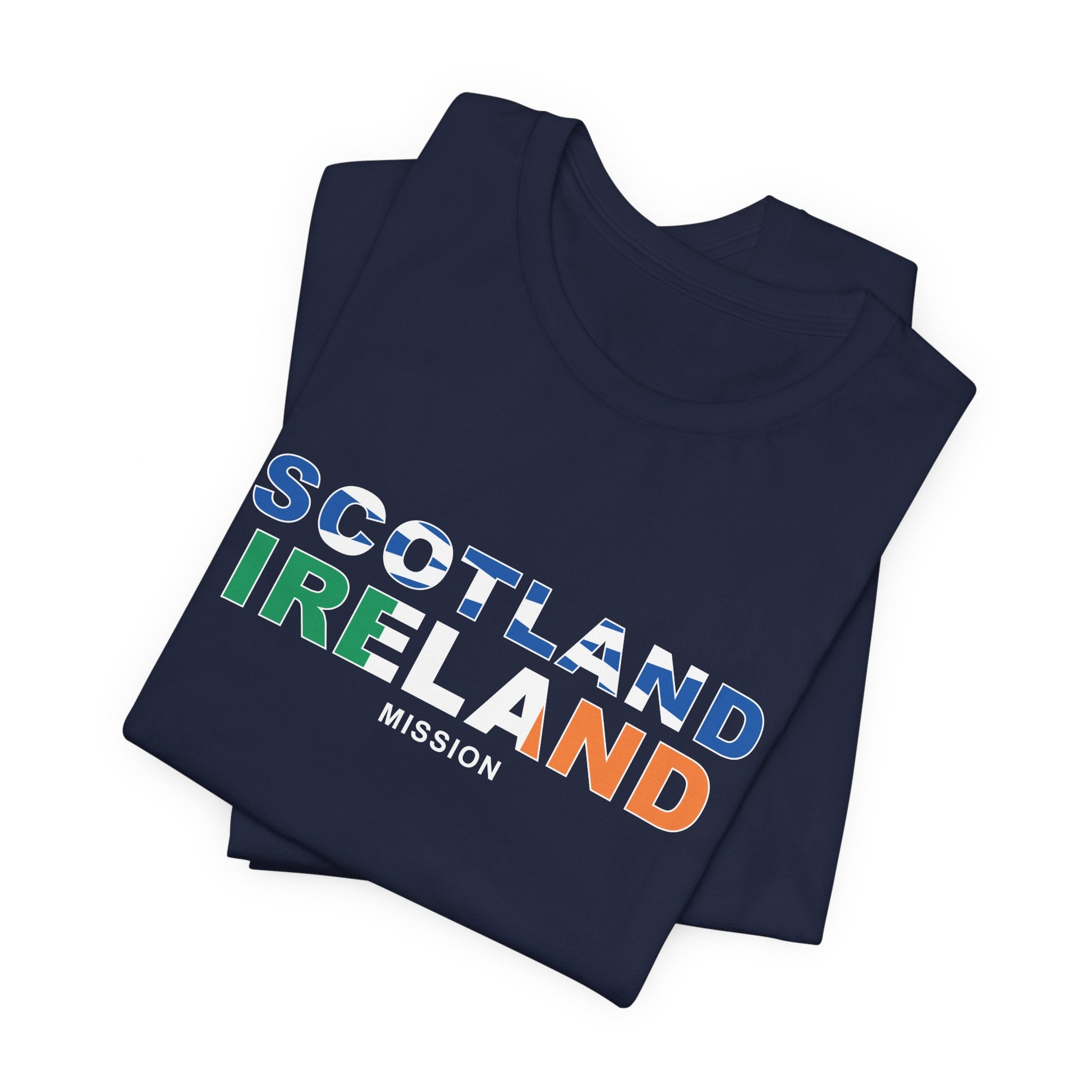 What sets this t-shirt apart is its unique design element: it features the flag of neatly superimposed over the Scotland Ireland Mission's name. This striking visual not only adds a vibrant splash of color to the design but also symbolizes the missions unity and commitment to the regions community. The flag's intricate details are carefully rendered to ensure clarity and impact, making this t-shirt a standout piece in any wardrobe.