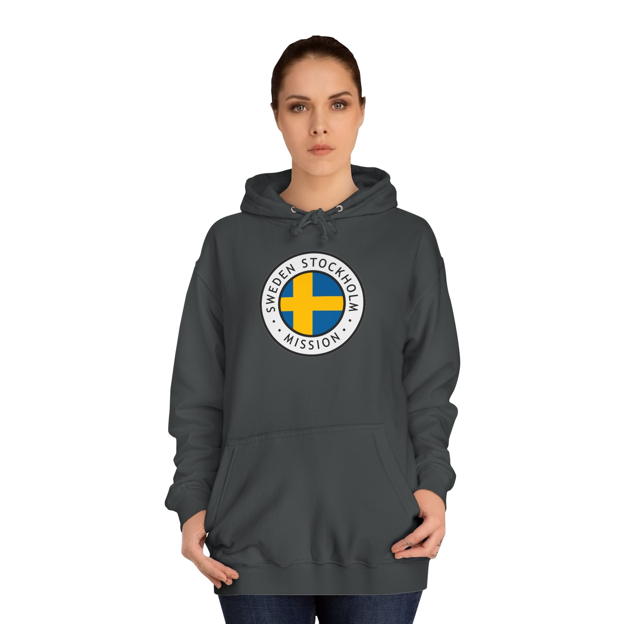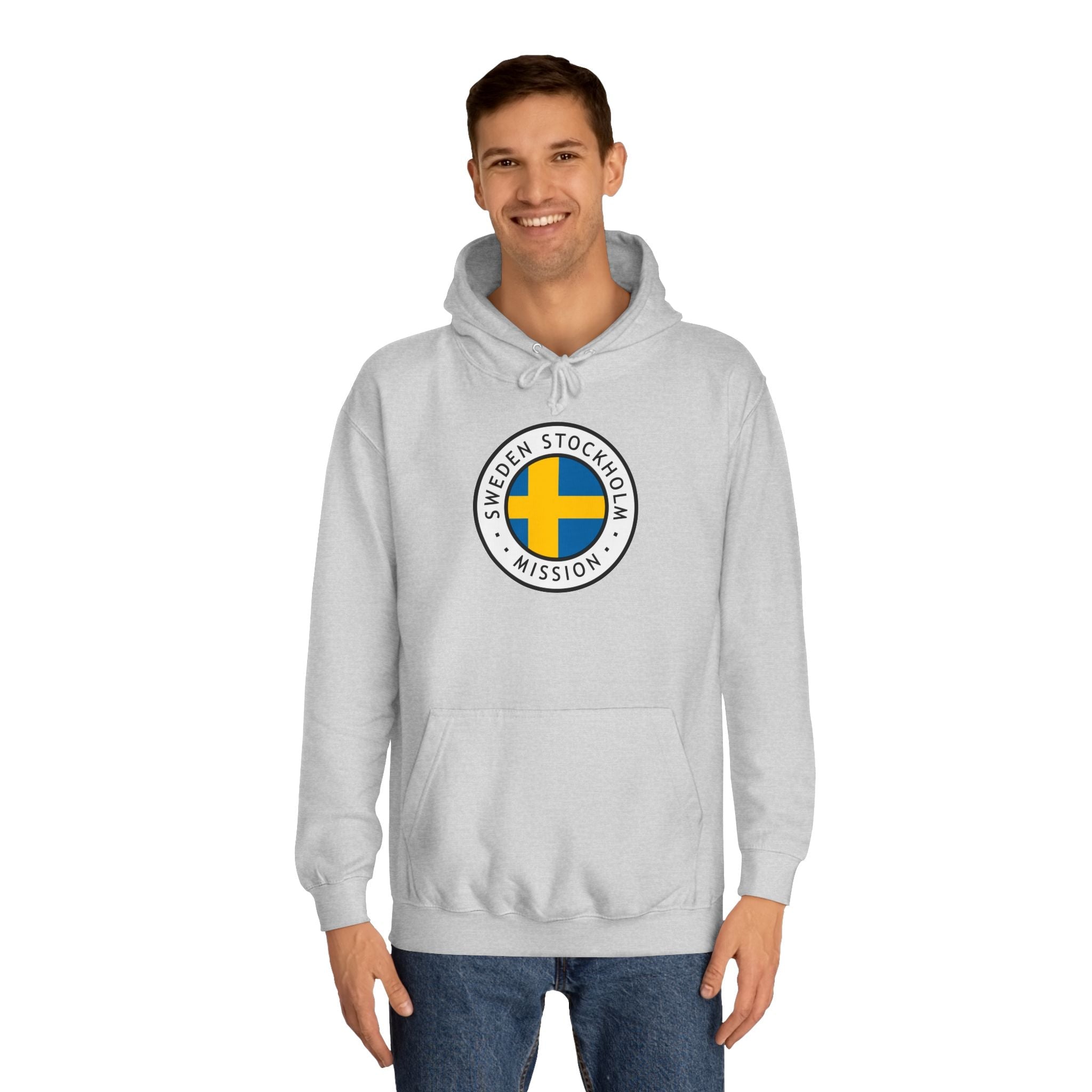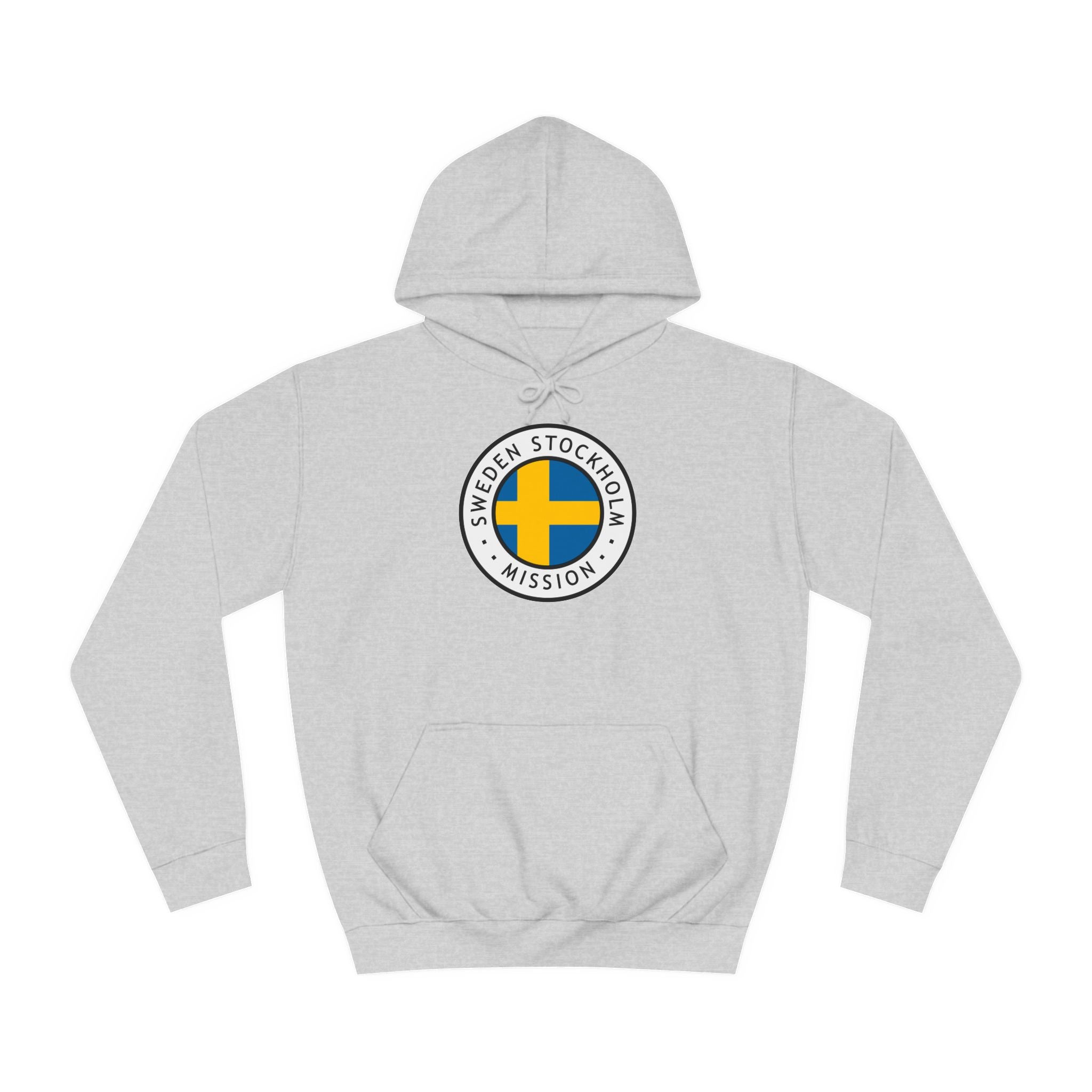 Stay warm and express your faith with our cozy Sweden Stockholm Mission Flag Logo (Black Border) College Hoodie. This hoodie features a unisex design with side seams that help the garment retain its shape in the long run. With a spacious kangaroo pocket for enhanced daily practicality, a comfy true-to-size fit, and multiple colors to choose from, these hoodies provide a comfortable wearing experience packed with style.