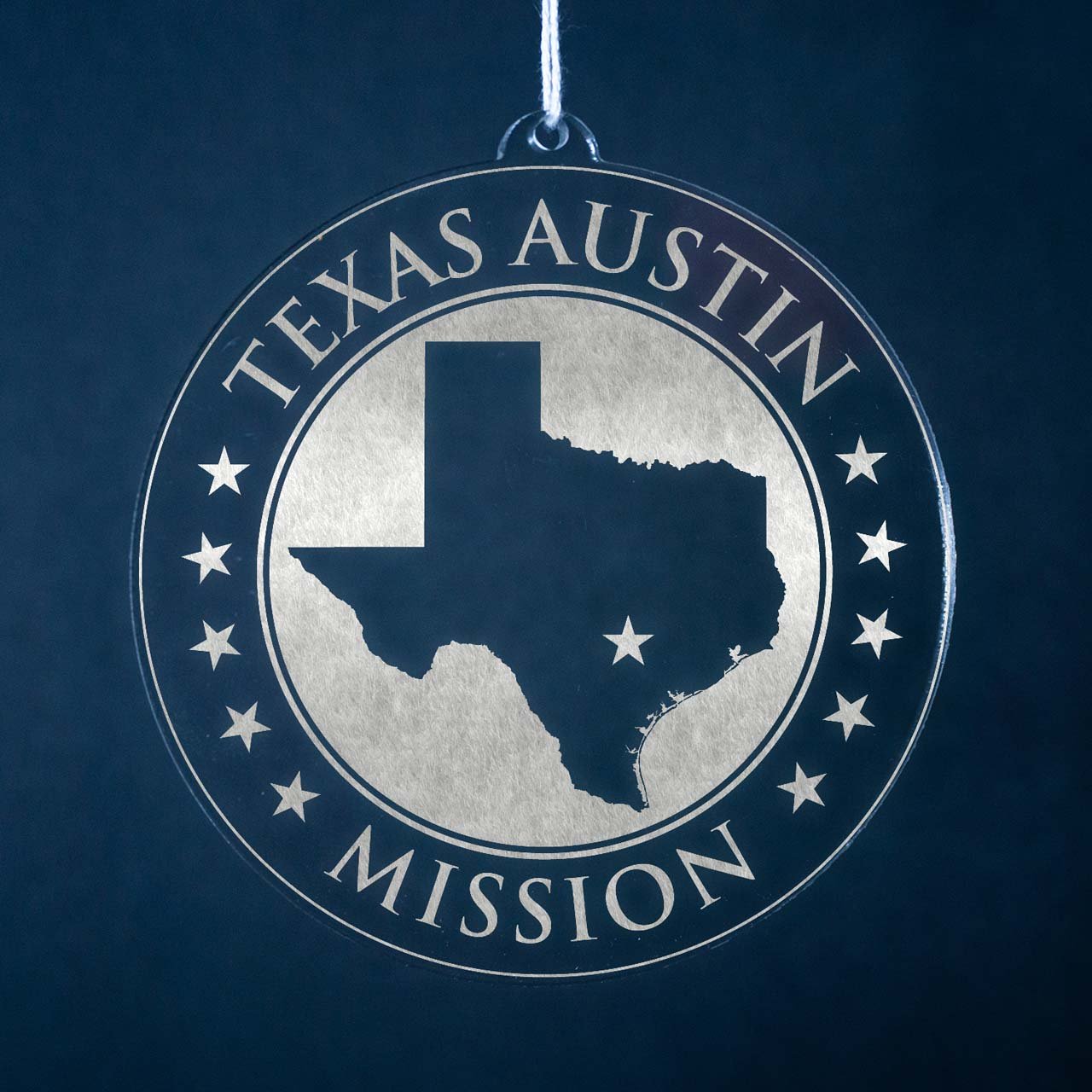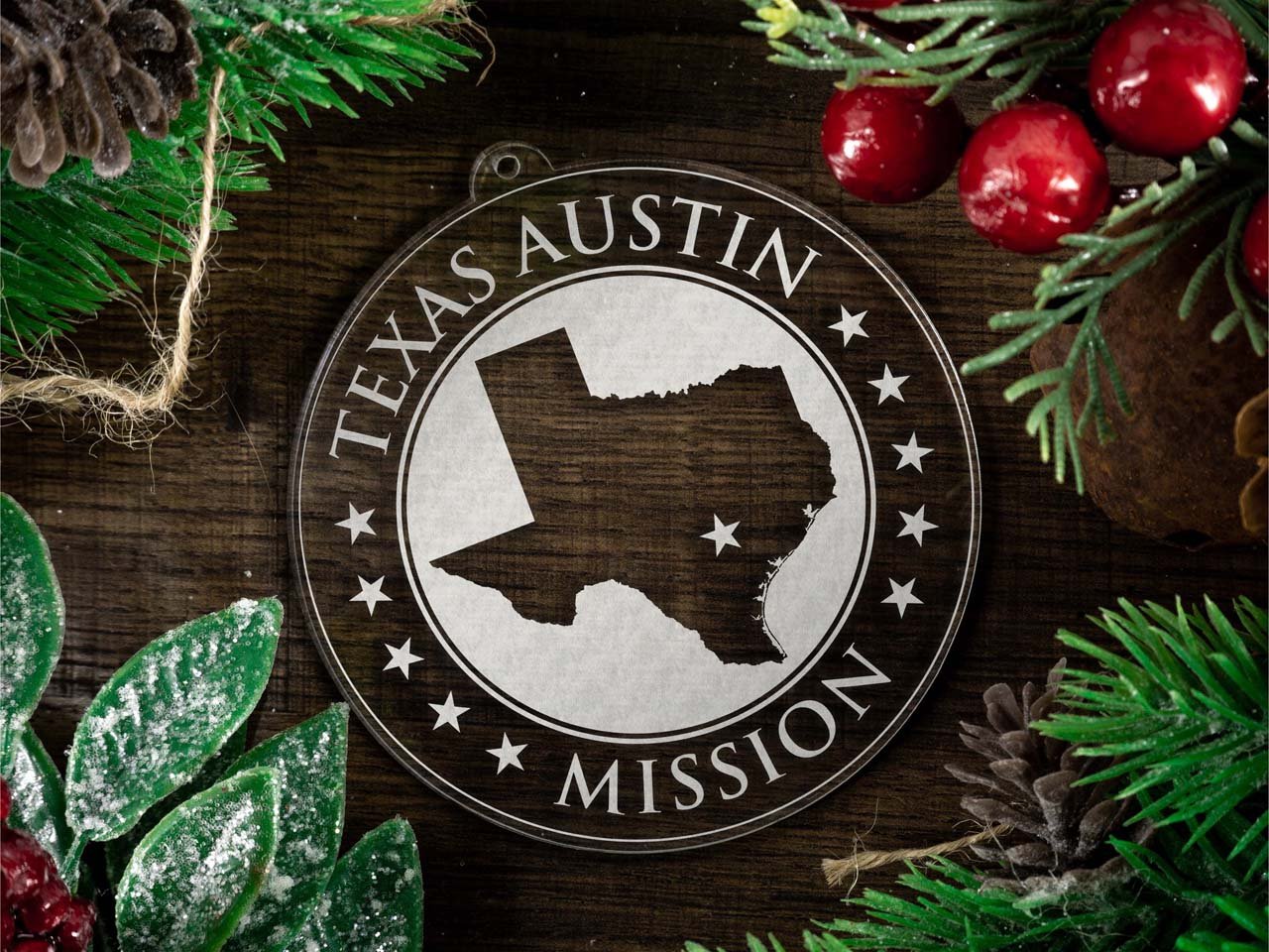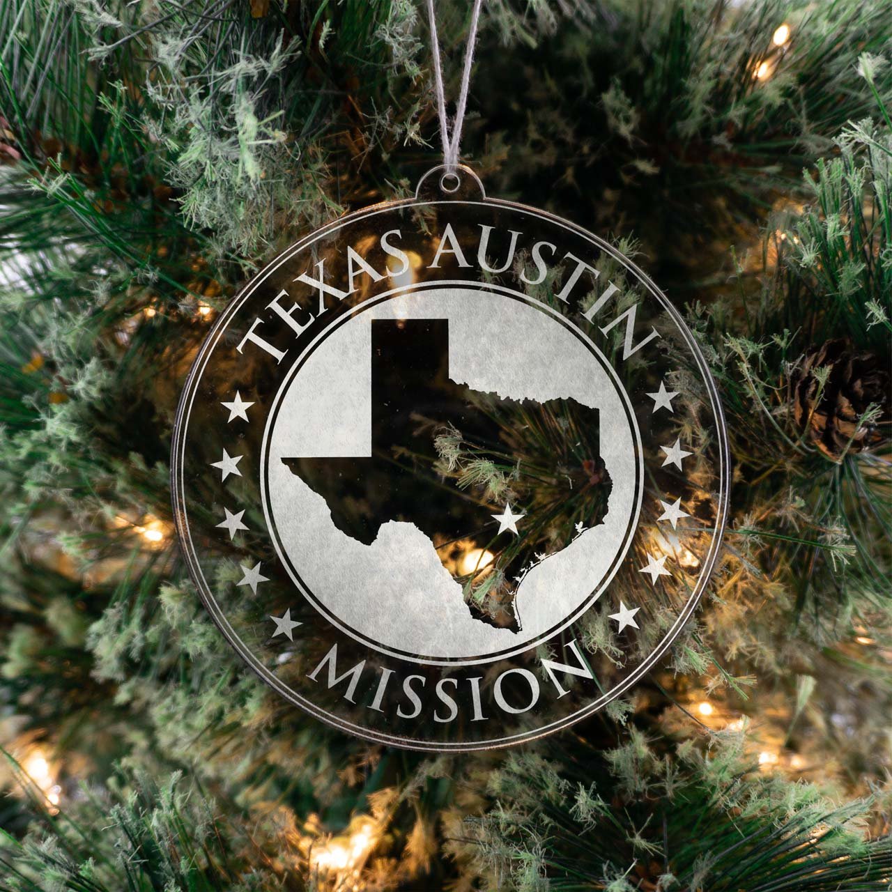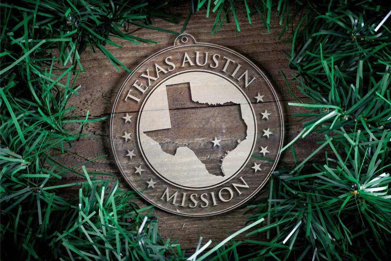 The design on this ornament contains a map of Texas with the "lone star" indicating where the mission was served.
