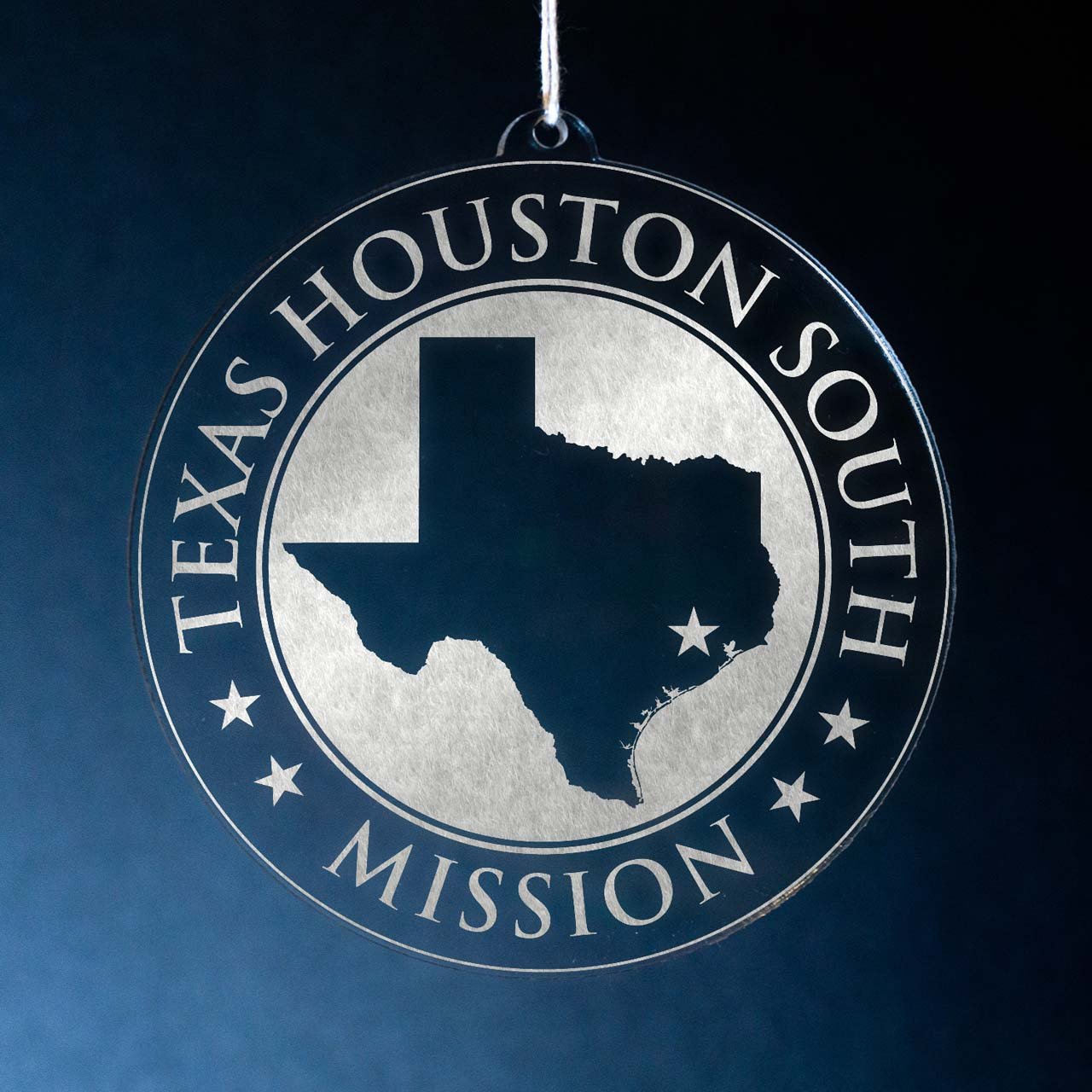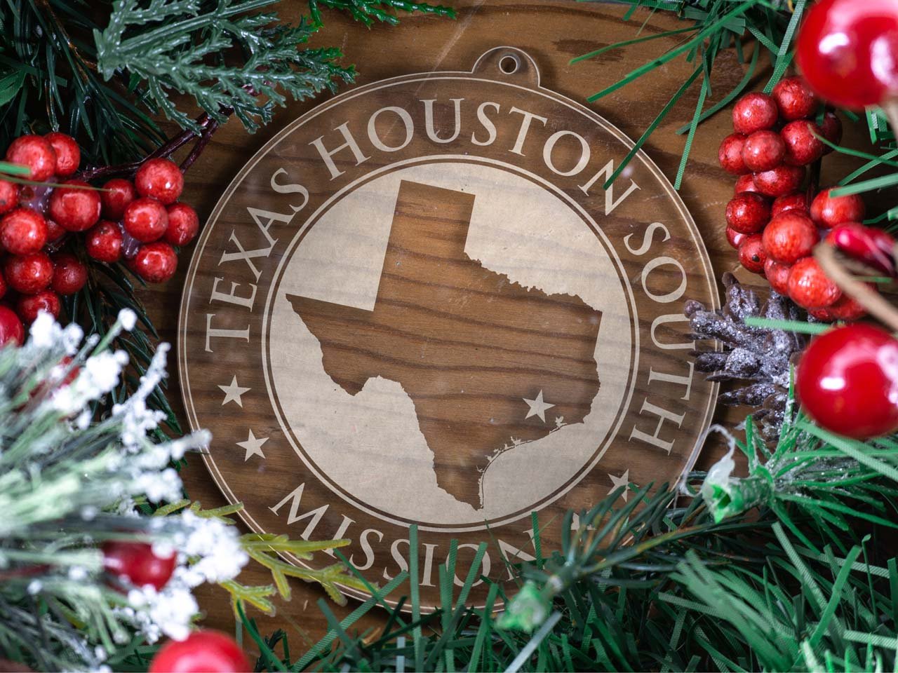 The design on this ornament contains a map of Texas with the "lone star" indicating where the mission was served.