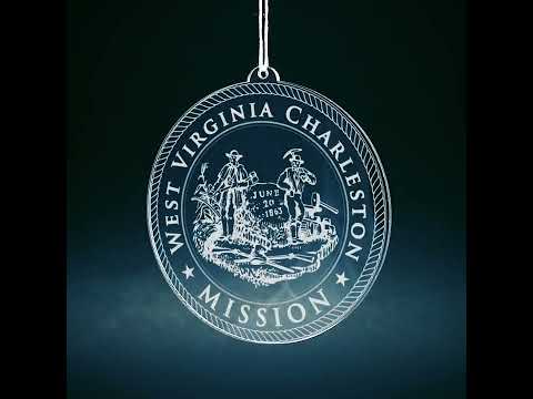 - Design: Centered is a circular depiction of the flag of West Virginia, featuring the state coat of arms with two crossed rifles, a miner, and a farmer, surrounded by a wreath of rhododendron, the state flower, set against a white background with blue borders. Encircling the flag is the missions name in a classic serif typeface.
